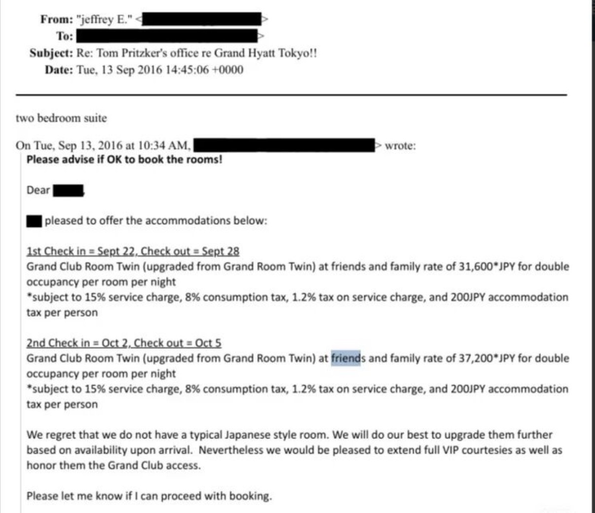 爱泼斯坦问凯悦CEO要住店亲友价