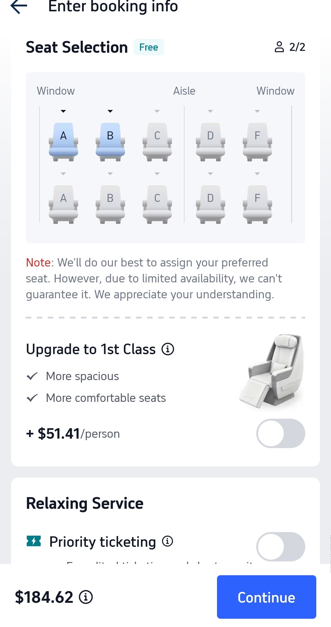 dummy booking了一下,没看到有seat selection界面啊,下一步直接付钱了