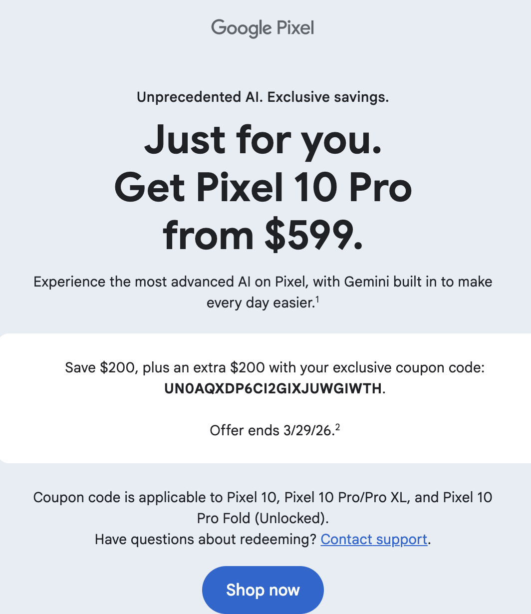 Coupon code is applicable to Pixel 10, Pixel 10 Pro/Pro XL, and Pixel 10 Pro Fold (Unlocked).
