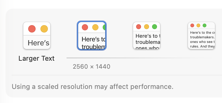 27寸4K就有点尴尬了. 2x缩放下逻辑分辨率只有1920x1080, 图标偏大, 屏幕放不下多少东西; 1.5x空间够了但边缘会糊. 主流操作系统对fractional scaling支持还不错, macos/windows下可以直接设置, 就连linux下sway + kanshi直接 scale = 1.5 也能用, 但macos会提示你