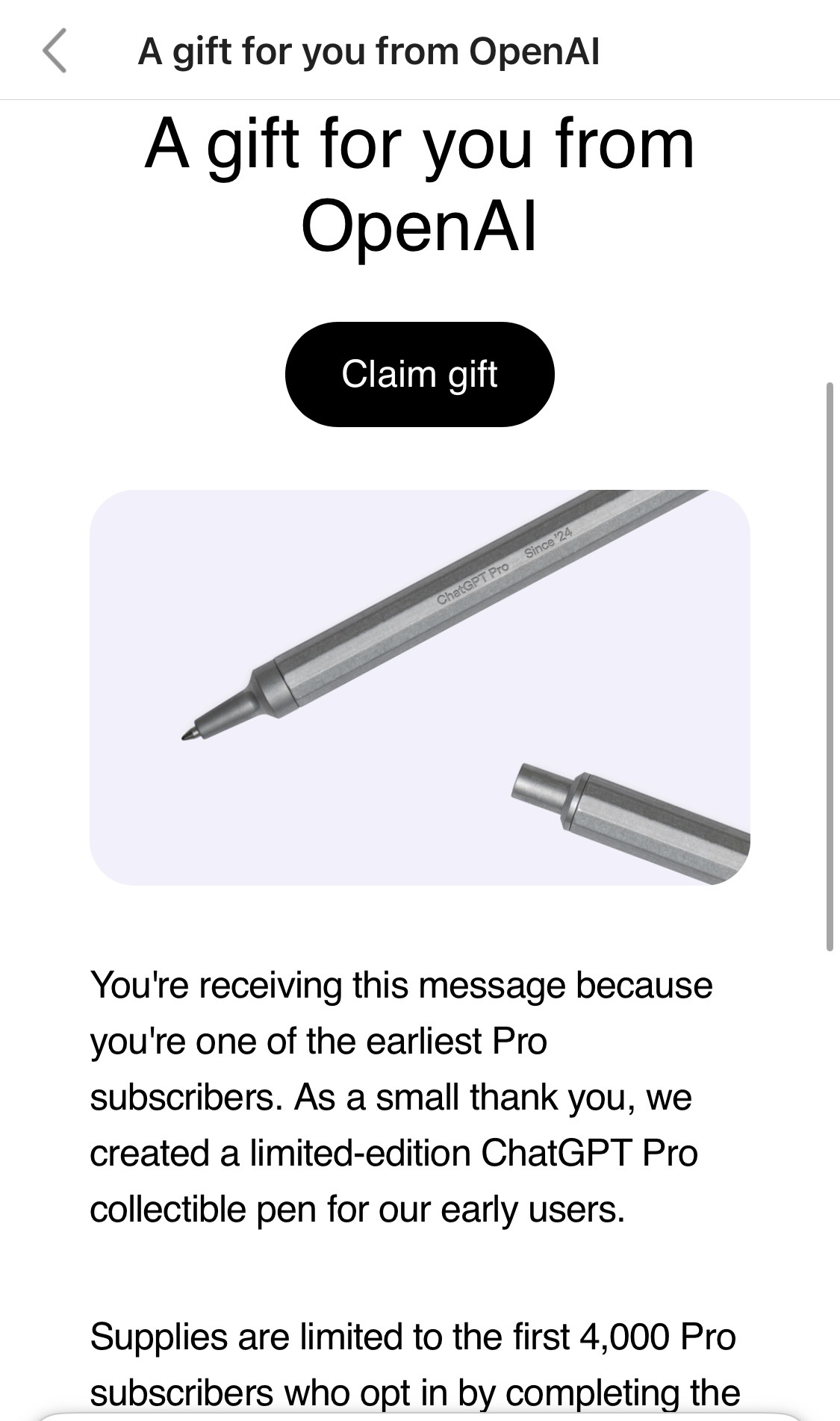 今天早上突然收到ChatGPT发来的邮件,大概内容是:感谢你成为最早一批Pro用户,我们将赠送你一只ChatGPT Pro collectible pen.