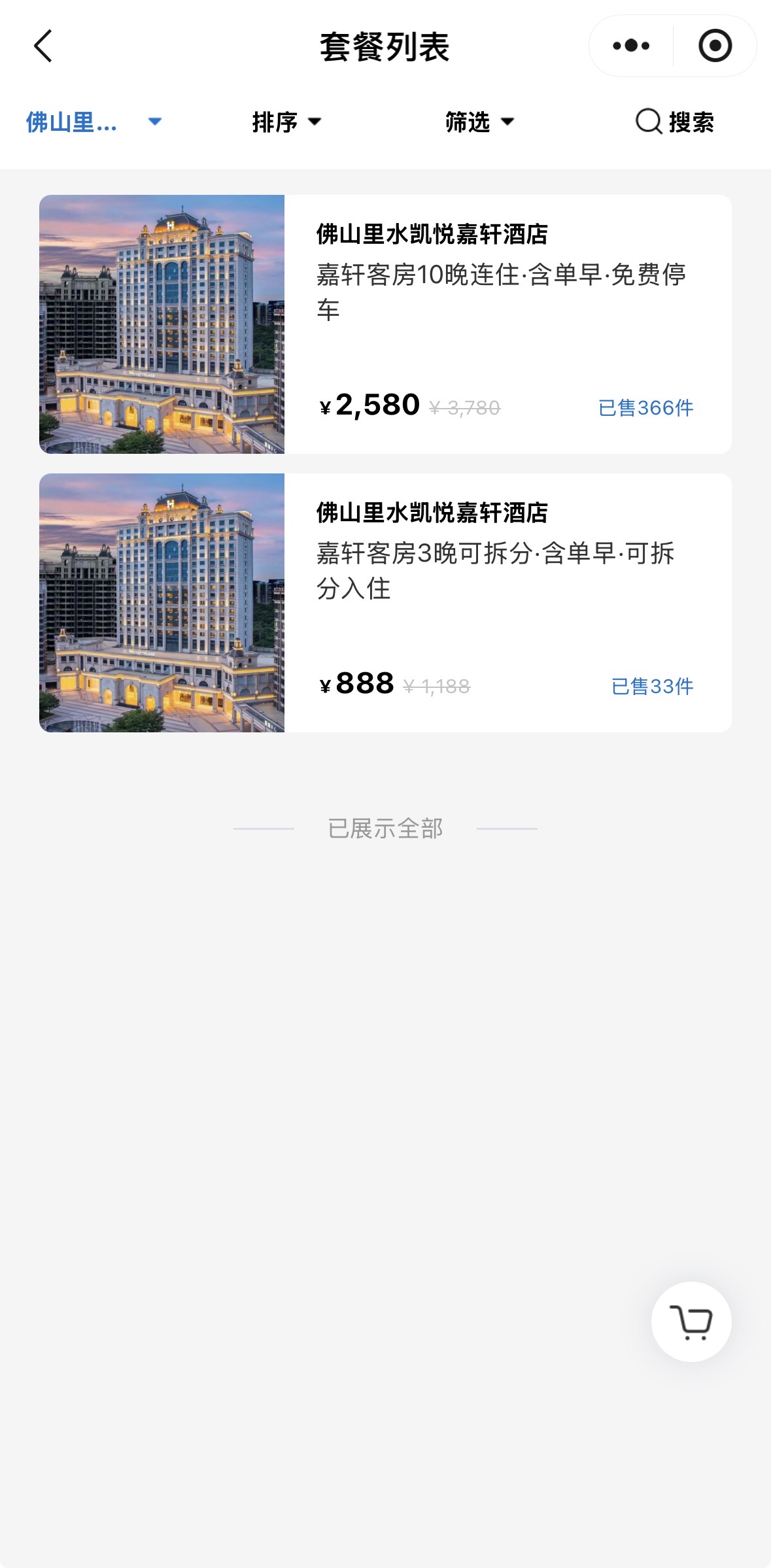 凯悦微信小程序,点下方“商城”,搜“佛山里水凯悦嘉轩”,就有套餐了。