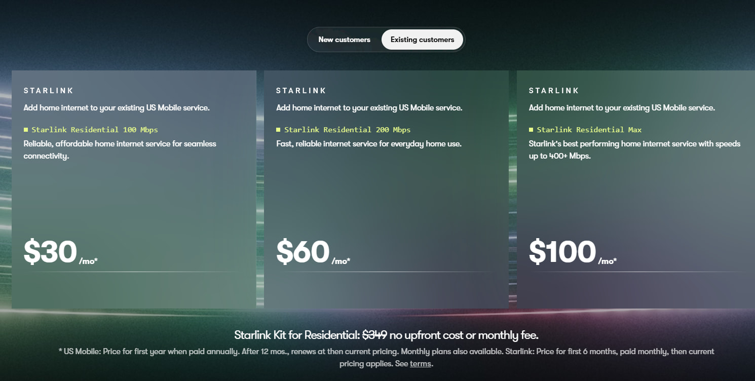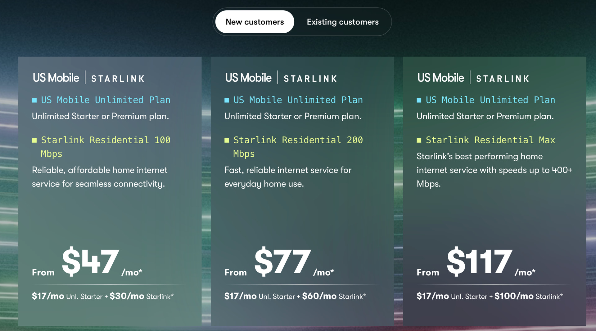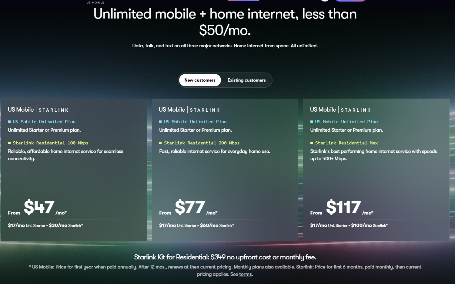 Promotional price 结束后丐版套餐每个月 75,实际上就是 Starlink 50 + US Mobile Unlimited Starter 25