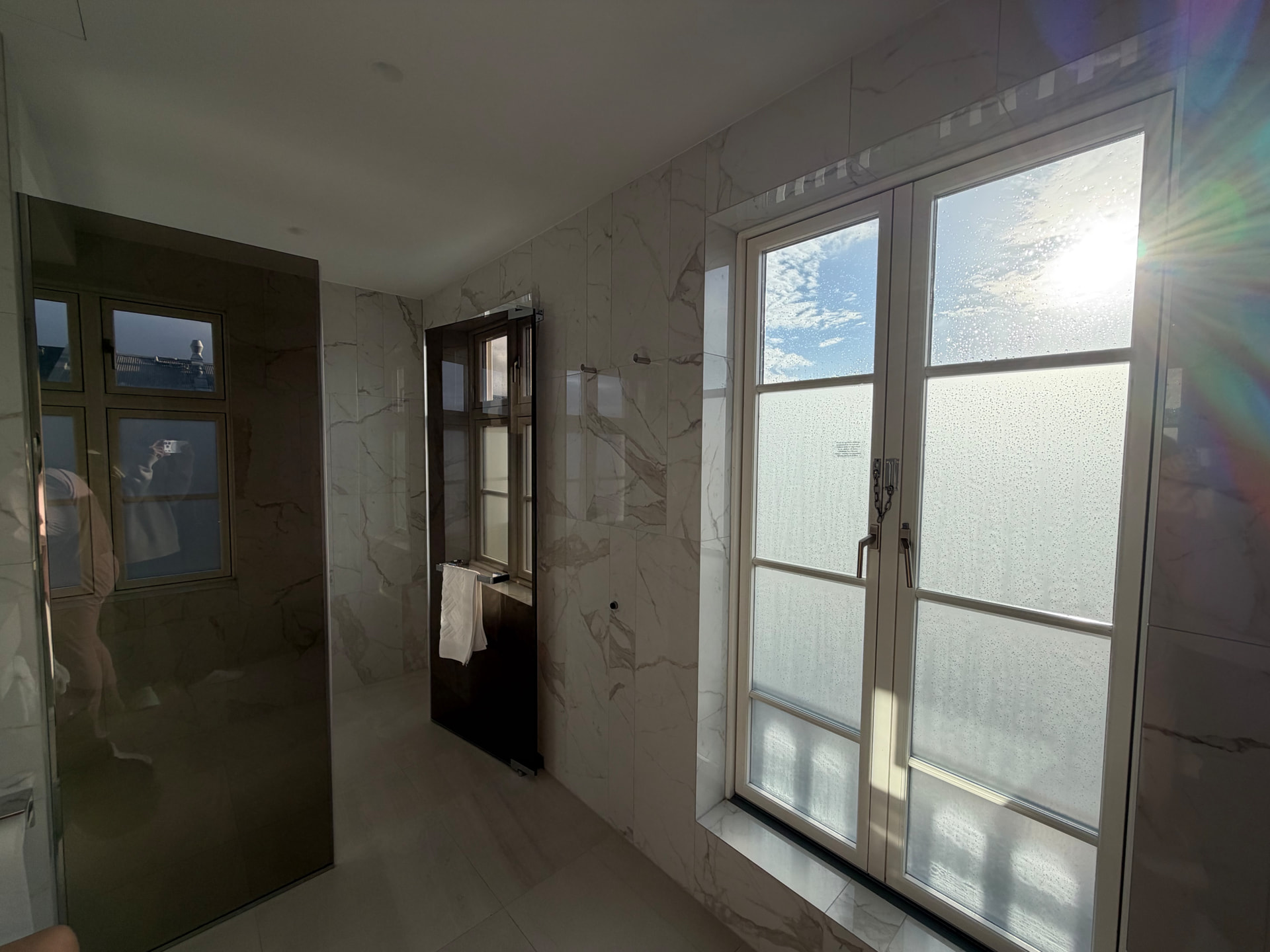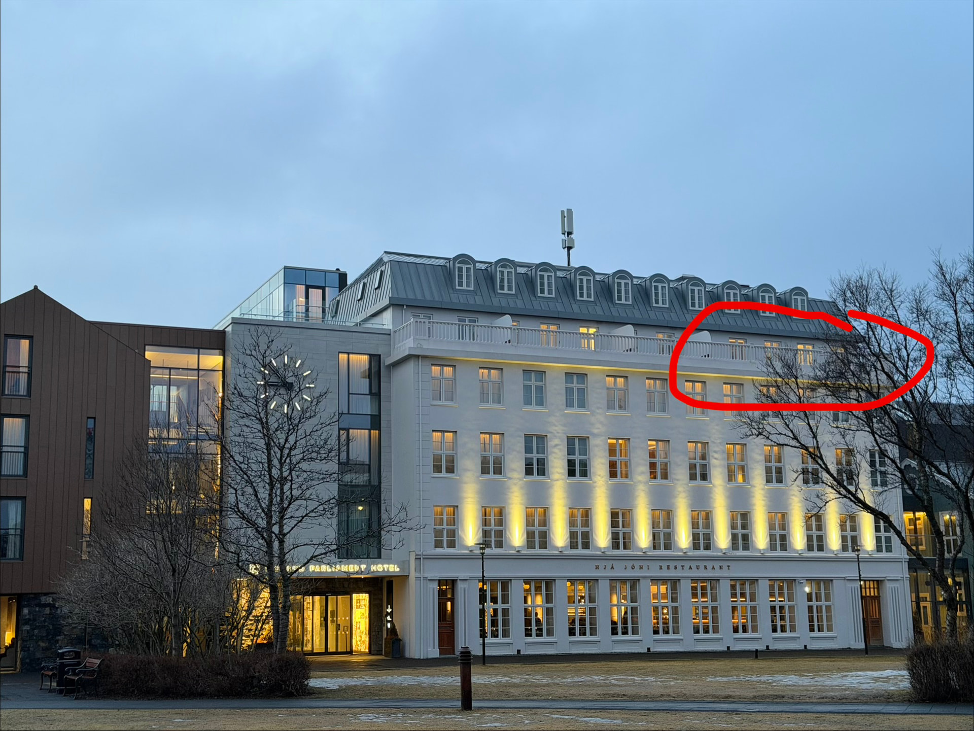酒店的公共区域像一个美术馆,墙上有很多冰岛本土艺术家的作品。入住的Junior Suite房间号517,内部软装比起EDITION就精致一些,床头,家具大量使用fluted木质贴面。整个空间是长条型,足够让娃从洗手间和床之间往返跑。最让人惊讶的是房间外是一个十多米长的大露台(下图红圈里的五扇窗户都是我们房间的,五层的几间房才有这个露台),房间和厕所都可以推门来到露台俯瞰广场,感觉可以随时向楼下发表演说。厕所的巨大shower room坐拥两扇窗,给人一种在房间里洗澡的感觉。