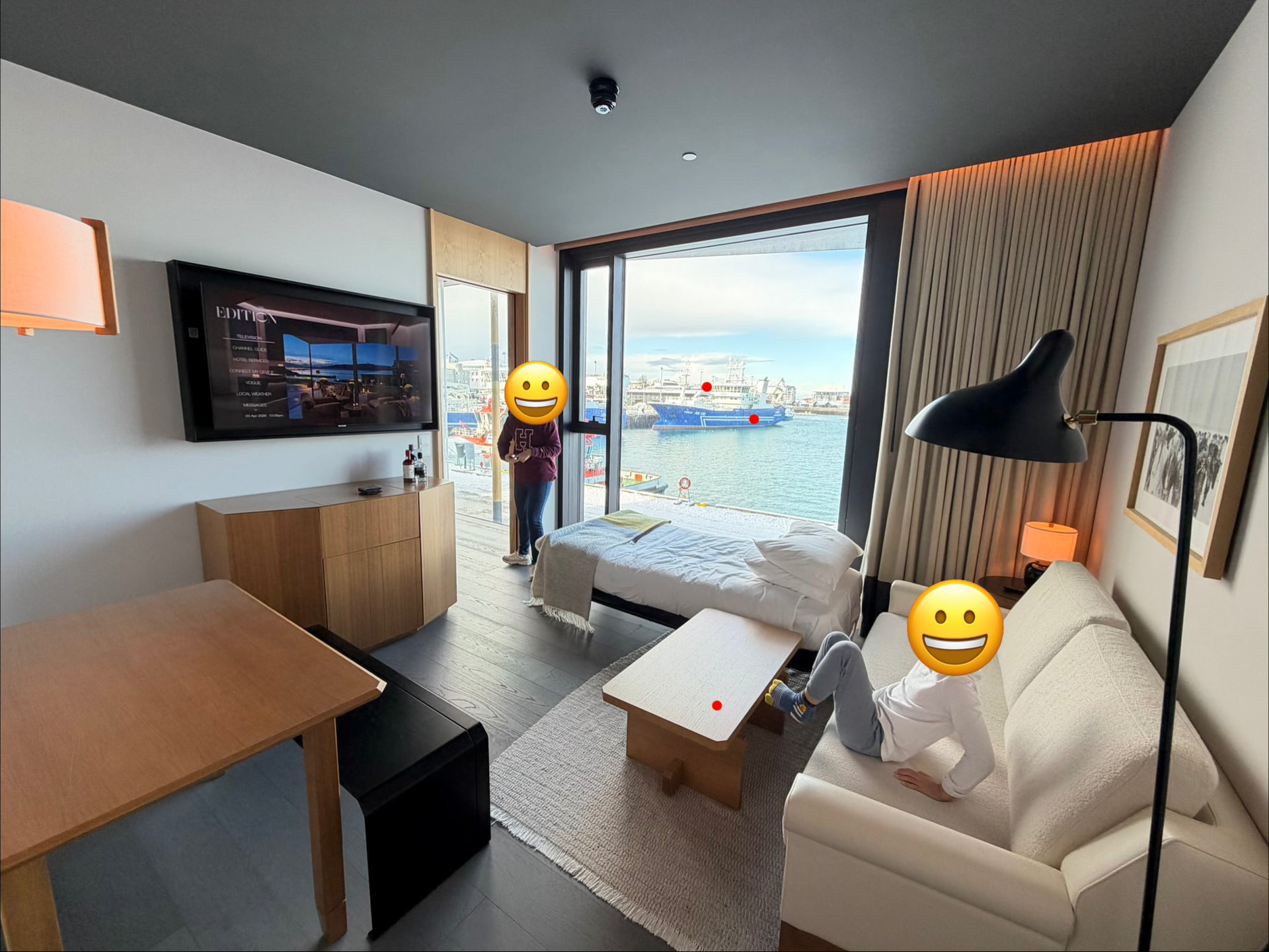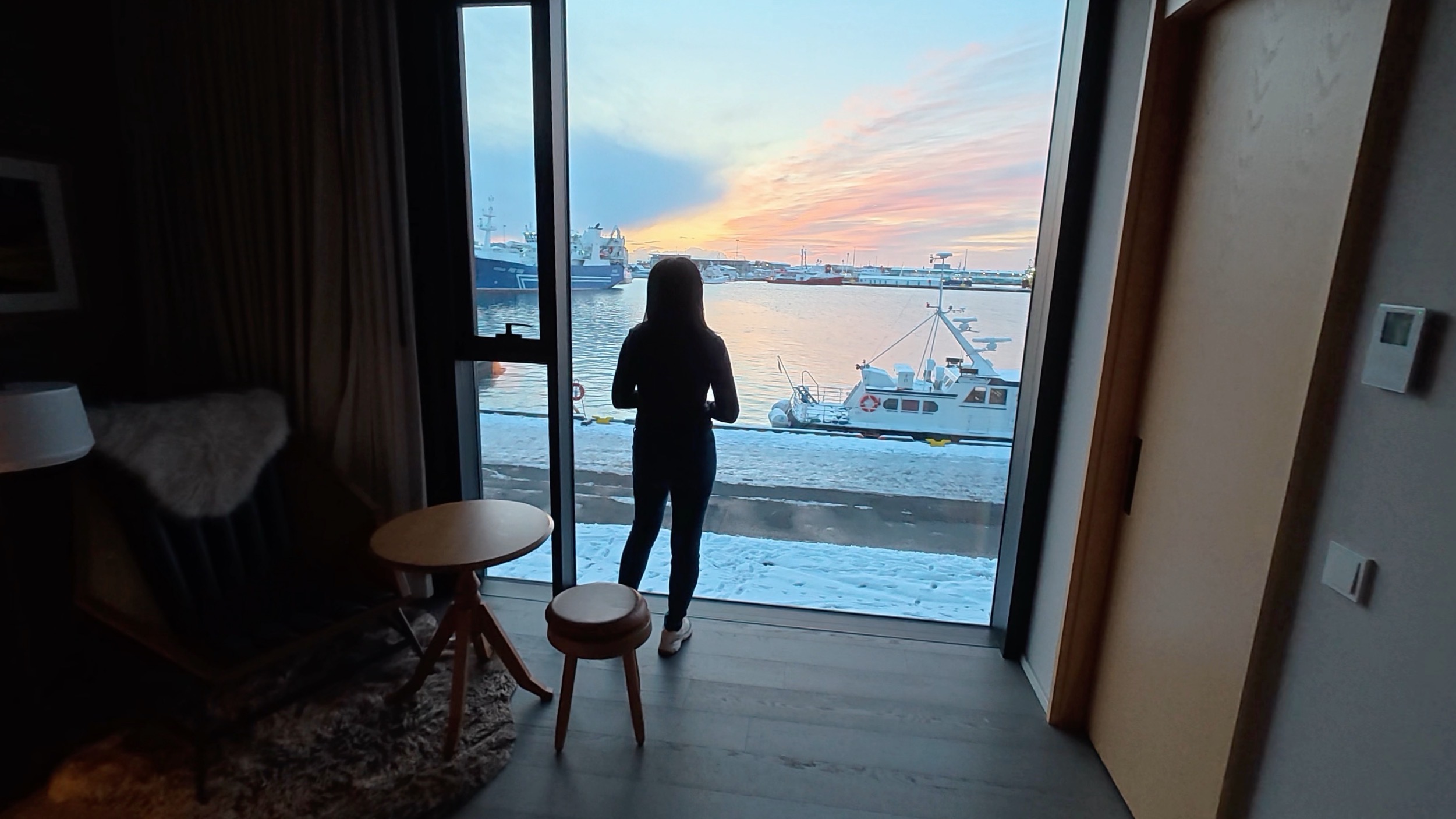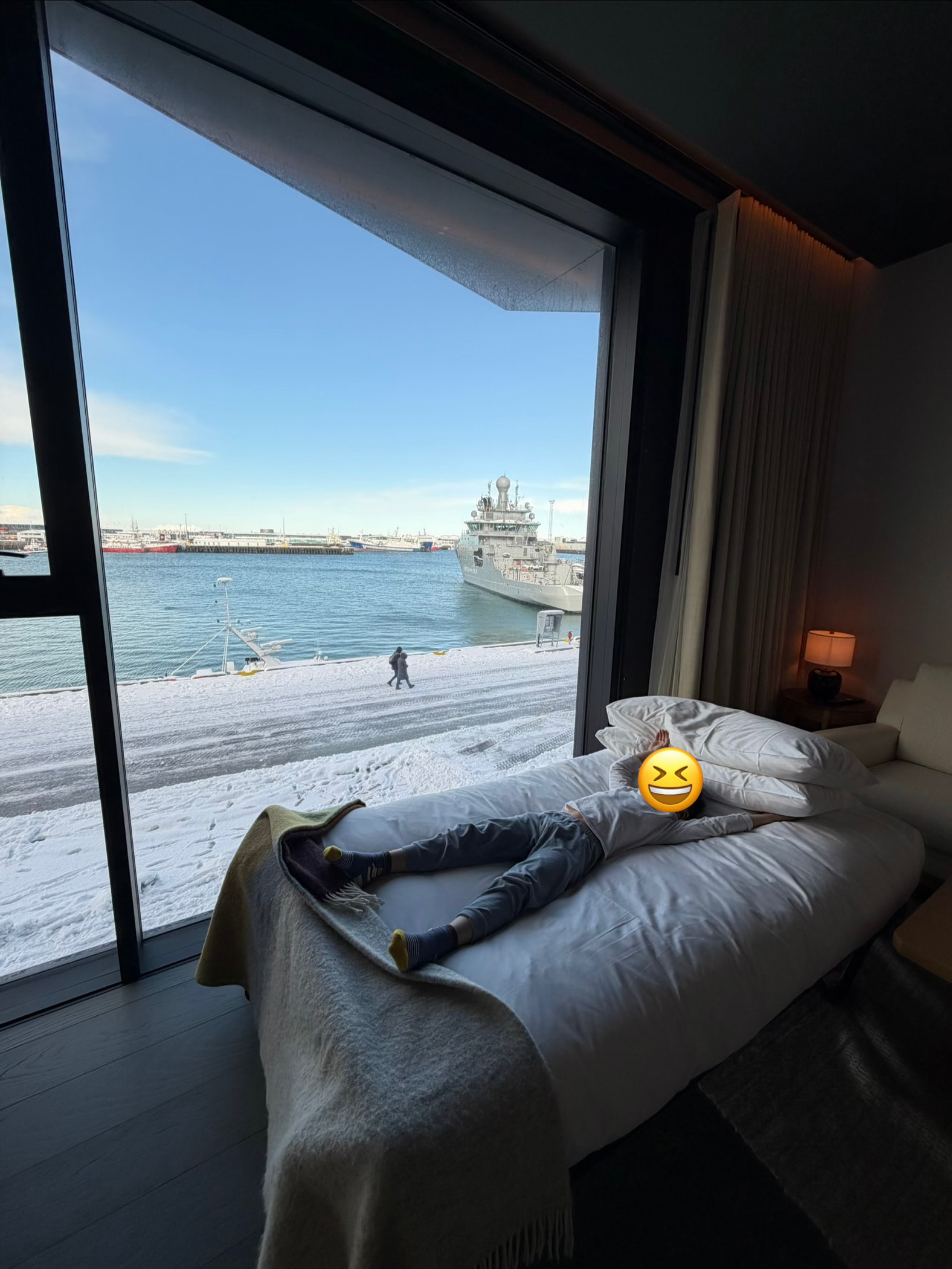 早上11点check-in时前台姐姐带我们进房间介绍设施,这间suite房间号是214,加床已经放在了客厅里,浴室大得可以蹦迪,地暖非常给力,软装不出意外的很全季,非常简约。落地窗直面海港,冰岛难得的蓝天白云加上,全家心情大好。