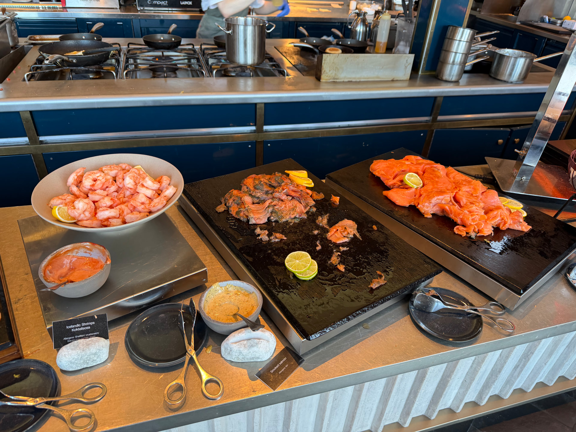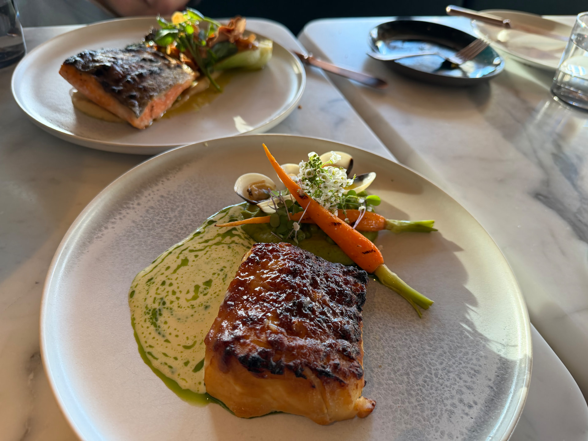 $100的credit折算成ISK 14,000, 我们在一楼餐厅用了晚餐。来冰岛怎么能不吃鱼,一份arctic char一份cod,价格都是ISK 7950(之后吃了其他冰岛的餐厅,才觉得这个价格并不算贵),都是冰岛local sourced的鱼,品质是真的顶。特别是miso glaze cod肉质紧实多汁,炭火直烤,5分钟就被我们空盘。