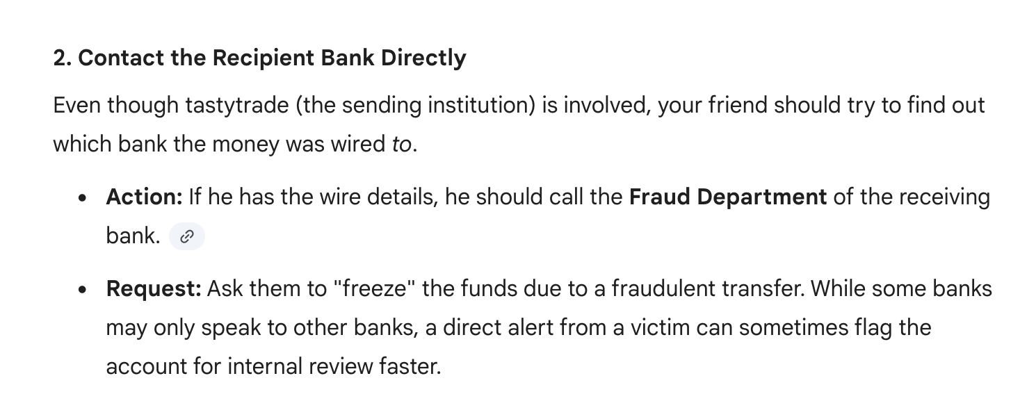 It looks like the wire was sent to Truist Bank account number 1430006402575. Unfortunately, it is too late to reject the wire request on our end. We have requested that our clearing firm, Apex Clearing Corporation, submits a wire recall request.
