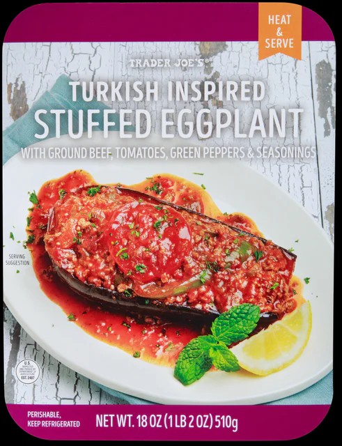 Trader Joe’s version of this Turkish-Inspired Stuffed Eggplant is roasted with olive oil, stuffed with savory seasoned ground beef and tomato sauce, topped with a slice of tomato and green pepper, then baked. The finished dish is complex and hearty, owing in no small amount to unique blend of herbs and spices including smoked paprika & fragrant mint.