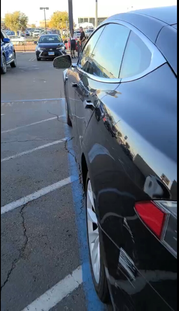 你们可以对比一下,这里有个视频里倒车雷达是响的,而且两条白线也比较准。这要是换我这辆model S,绝对已经蹭了。