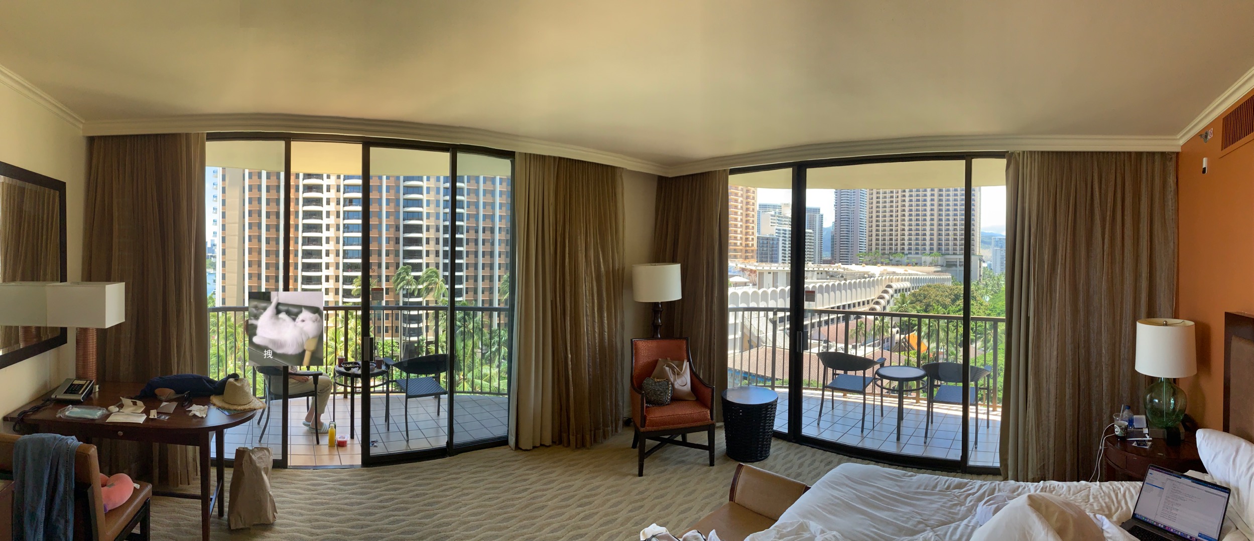水钻可以app上提前选房型,我开始自己选的是Tapa高楼层的一个“疑似”coner room。到的时候问前台小哥有没有升级,前台小哥说给升到了Rainbow Tower的Ocean view而且也是个corner room。进屋才发现挺坑的,说是Ocean view但其实正对着的是人工的泳池沙滩,而且楼层比较低,他们下面的Luau很吵。