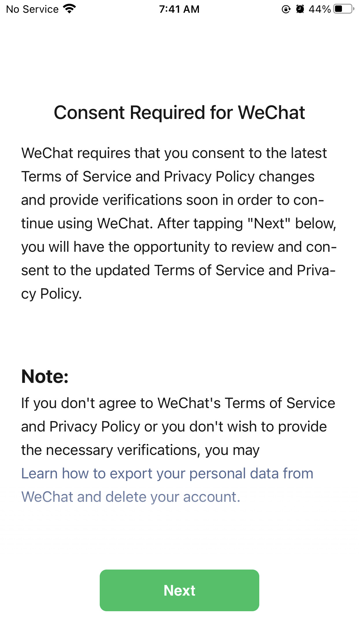前几个月就开始的国内国外微信分家,美国WeChat版本已经阉割掉了许多function。但每次还总是弹窗要求consent,我每次都左上方打叉