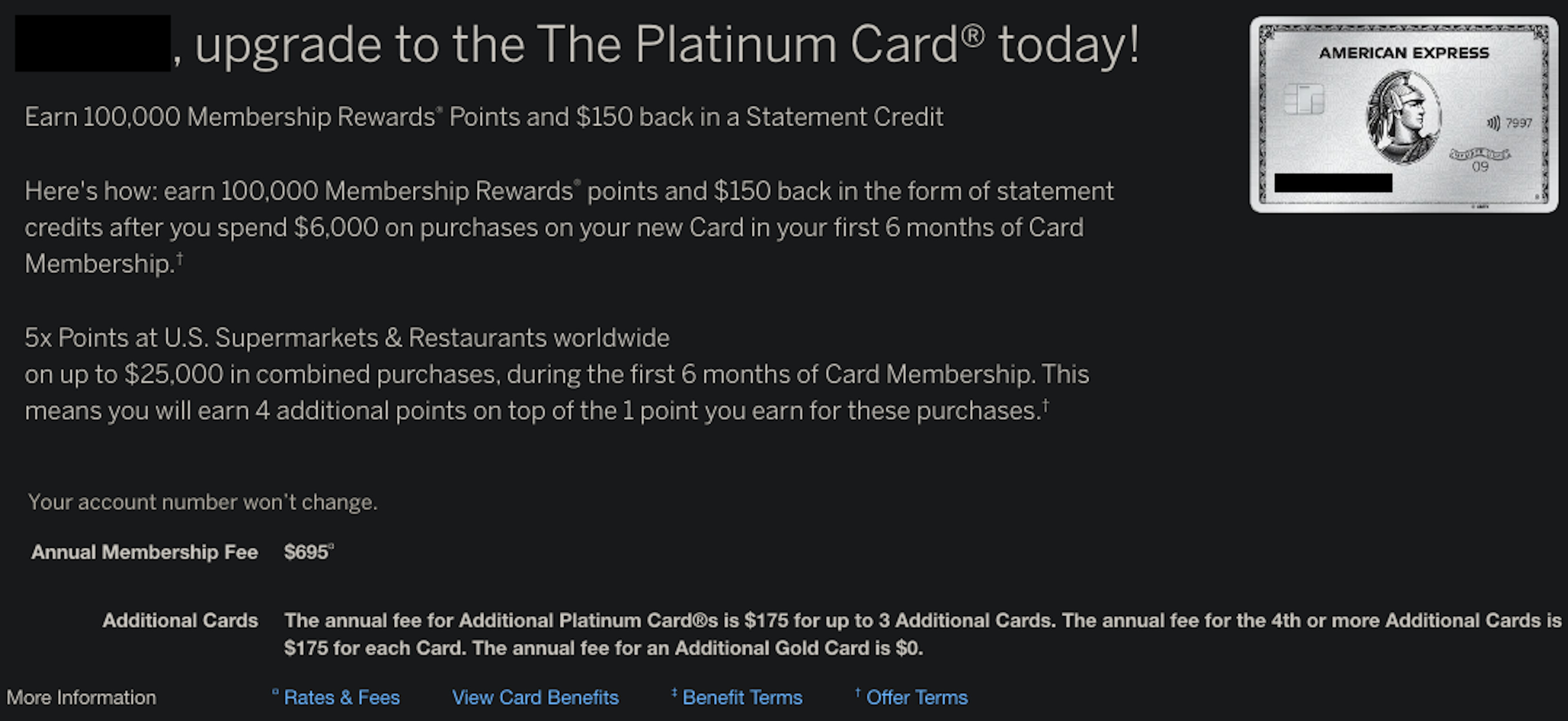 19年初申的这张 Gold,20年拿了一次retention,21年本想关卡但算上以前的$100航空报销发现能值回年费,就决定再持一年。然后一个多月前在查 prequalified offers 的时候看到了这个升级 offer,捂了一个月今天成功升级。升完后没收到任何邮件,但已经和客服确认升级成功