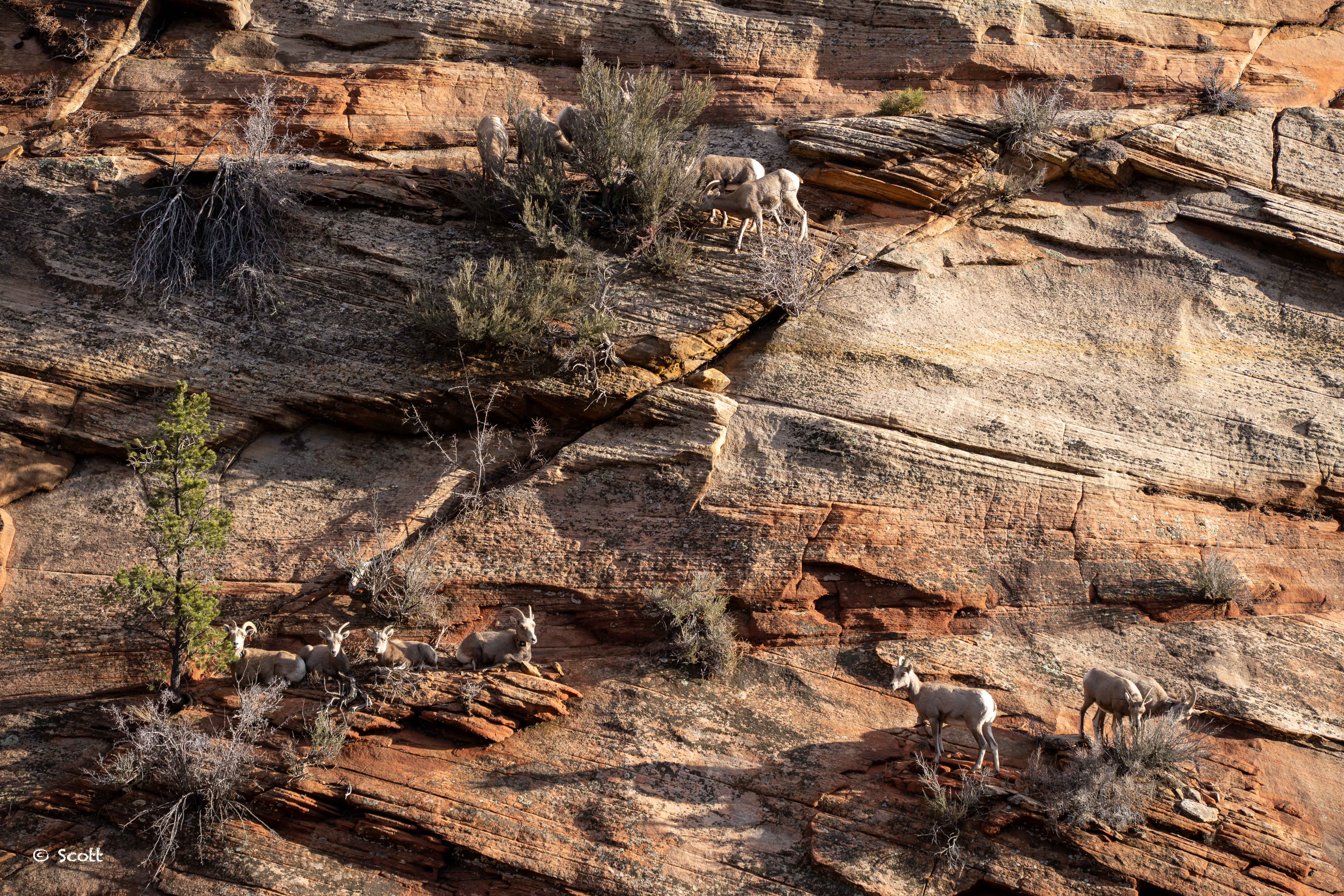 Zion比较特殊的动物是Big Horn Sheep大角山羊,往往2-3个零零散散出现,但我们黄昏时候在Trail边上一下看到一群,一时间不知道该拍哪一只