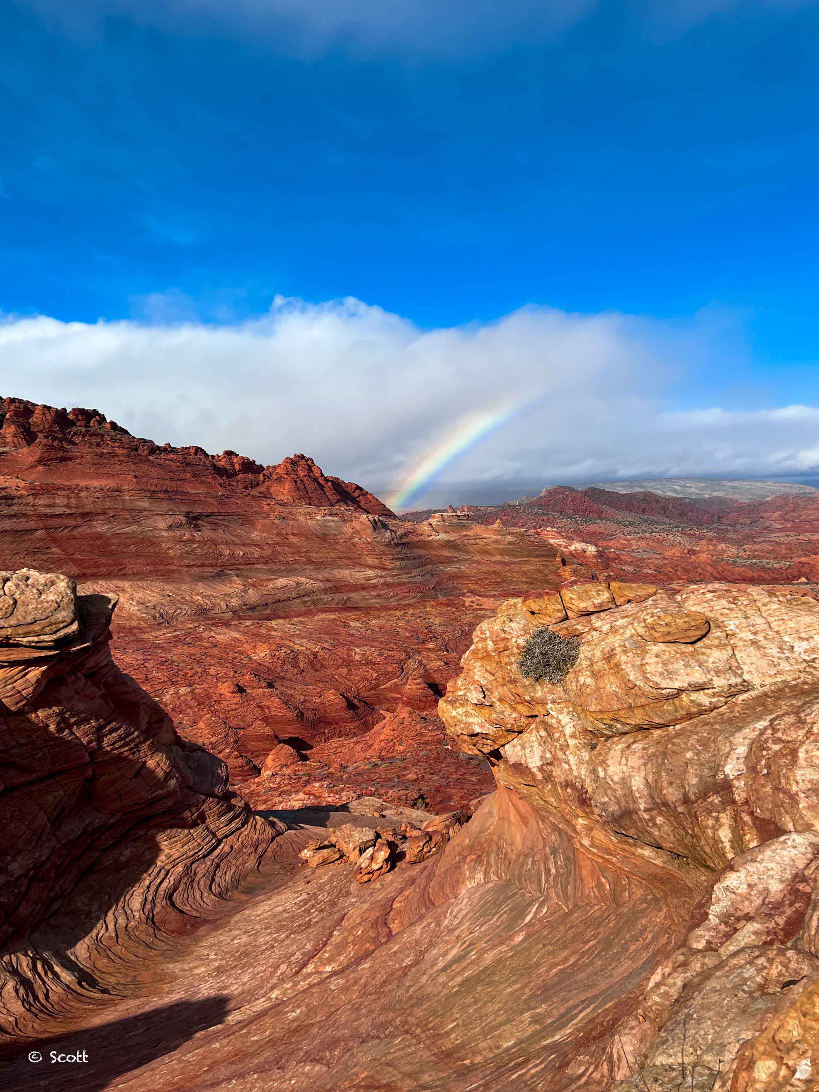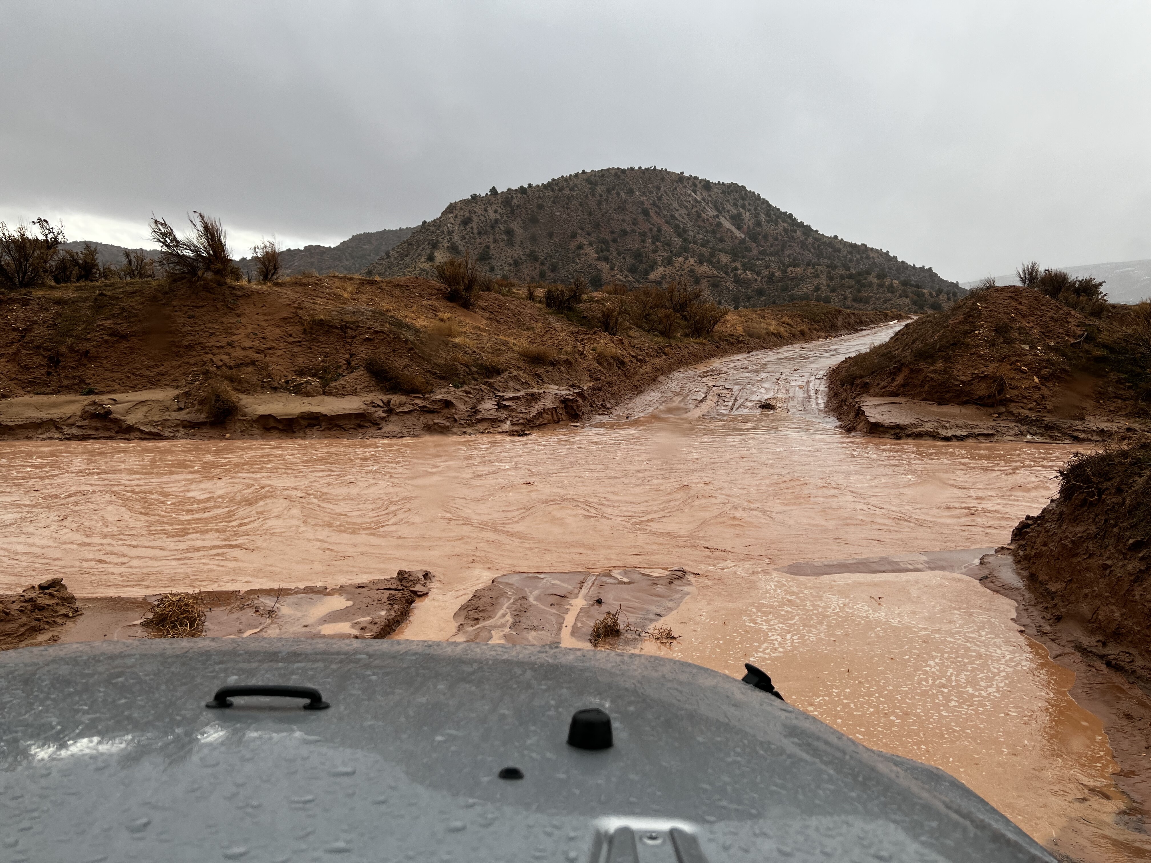 12.24当天波浪谷一带发了暴雨警报,看似美好的波浪谷成了我们此行最难的一次旅程。从Kanab出发去波浪谷需要开一段10 miles路况非常差的土路,这段土路伴着一夜暴雨变得泥泞不堪,甚至冲出来一条比较湍急的小河…… 这要是一般的trail果断就不去了,LZ几年前和朋友玩过一些越野,对牧马人操控比较熟悉,换了4L档位开过去了。旁边有一车人开着大切没敢过来。理论上当天可以进来16队人马,因为恶劣天气的原因我们全天只看见3队 ![]()