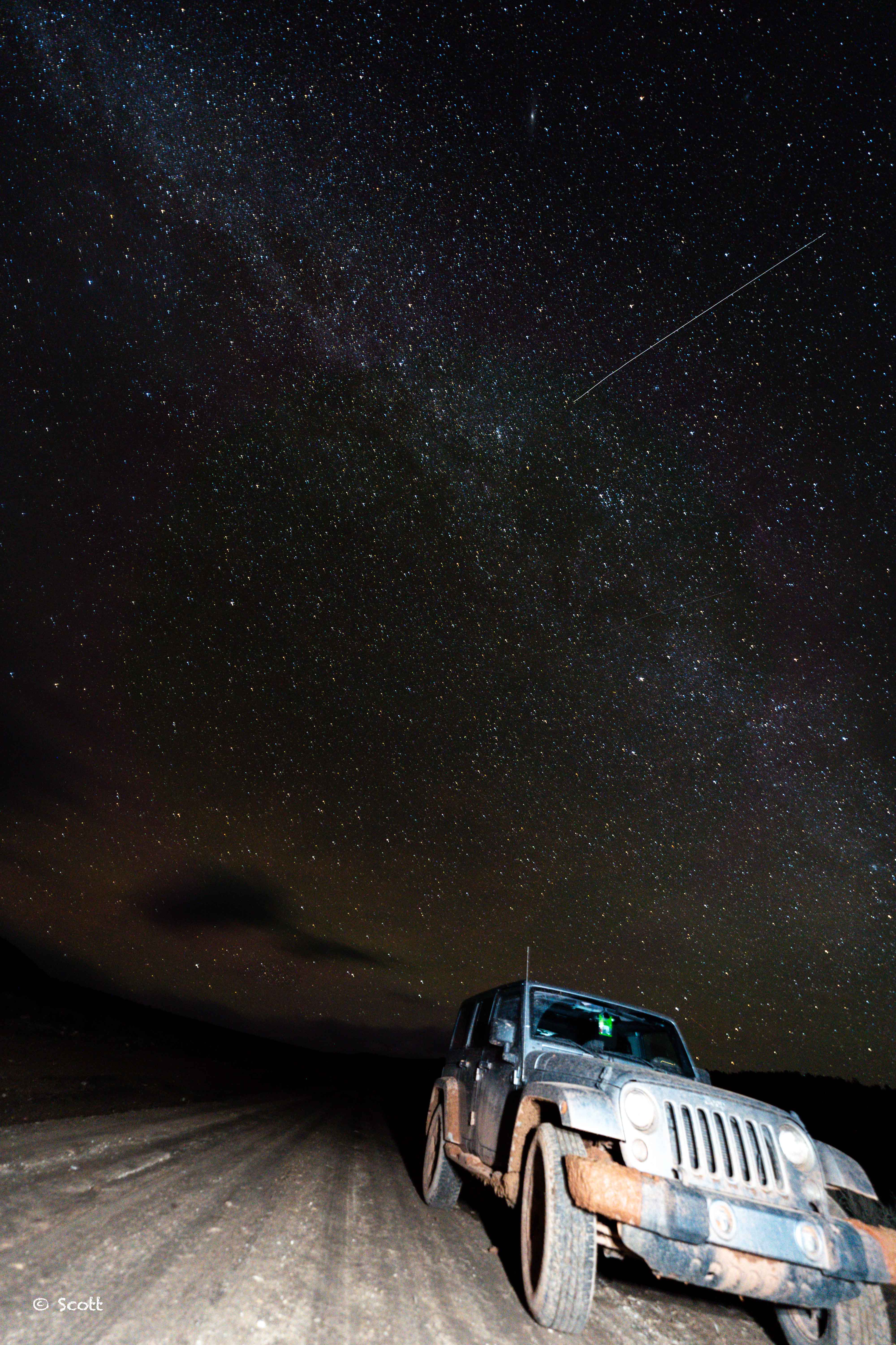 爬完泥巴路过一片旷野,看到天上比较晴朗,索性停车休息一下顺便拍个星空,无意间拍到了划过平安夜银河的流星,配上我们此行最大的功臣做前景,算是给这一天画上圆满的句号。
