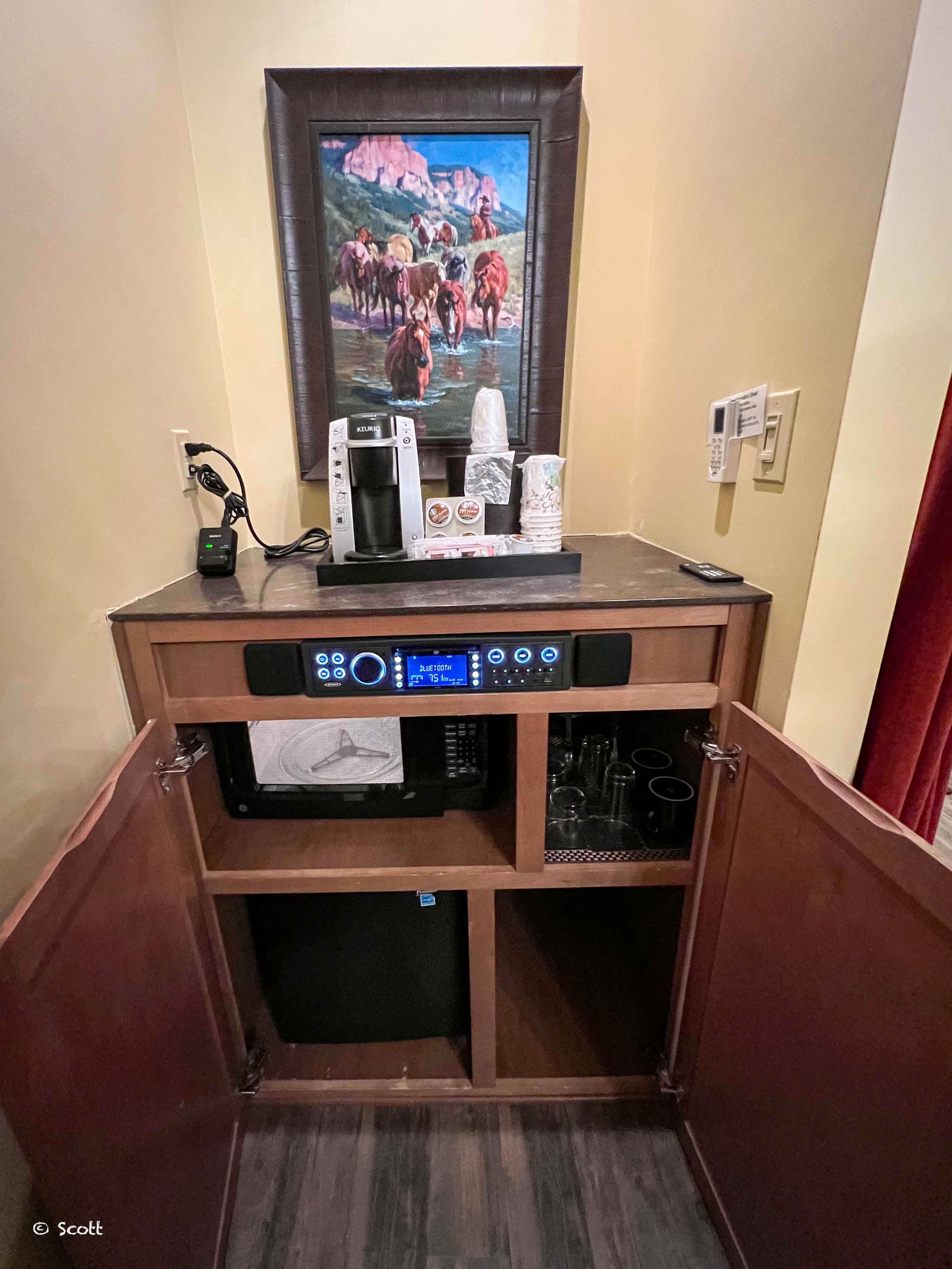 房间里有胶囊咖啡机、多媒体音箱、冰箱、微波炉。