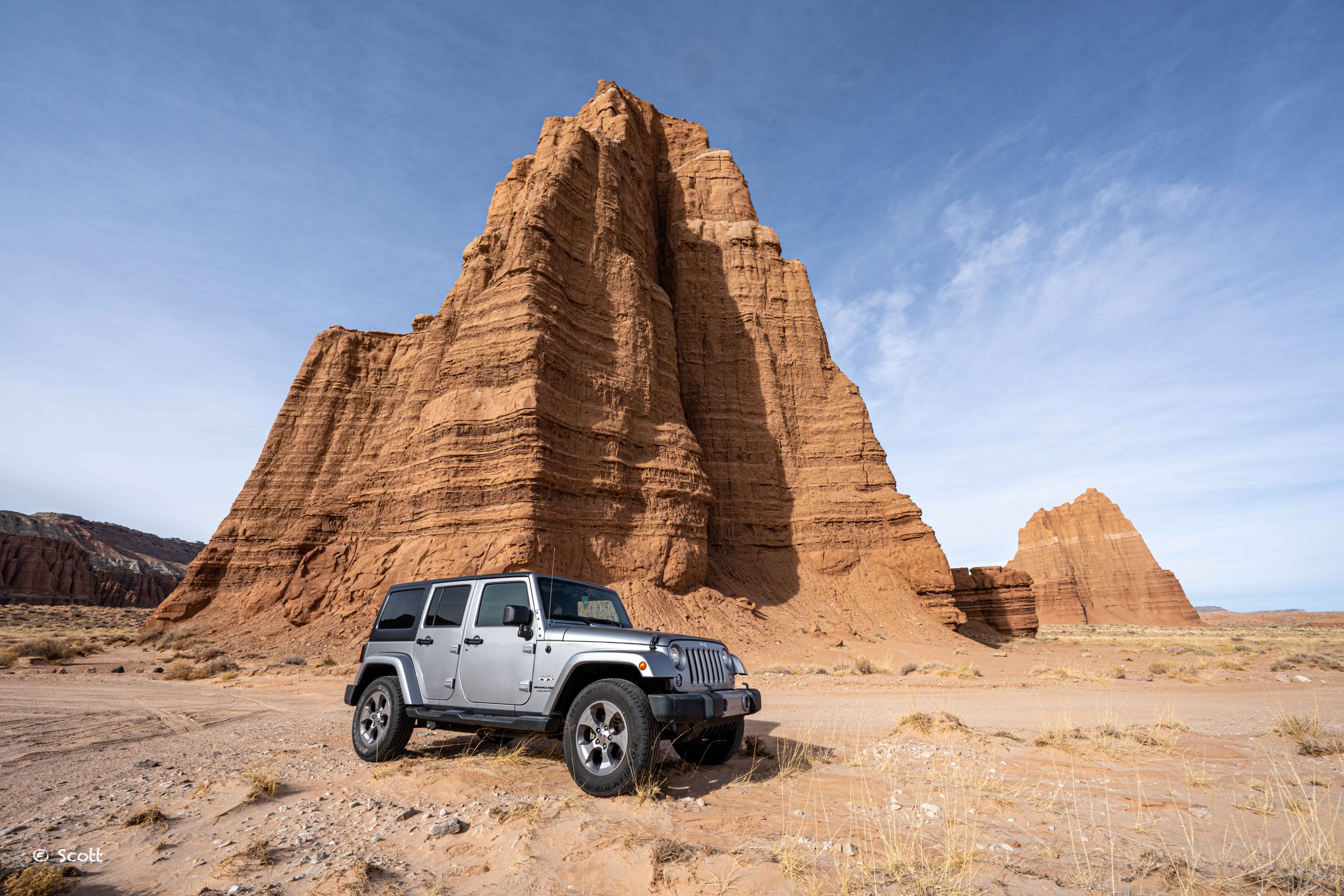 圆顶礁是为数不多有4X4 off-road越野线路的国家公园,北侧的71.2 miles的Cathedral Valley OHV Loop是一条非常受欢迎的线路,进出最好开四驱车,基本没有信号,记得加满油。我们往返开了1/3去 Temple of the Sun(下图远处山丘)和Temple of the Moon(下图近处山丘)。看名字就知道这里是日月神教大本营,每年日月同辉之日,任我行和东方不败会在此切磋武艺,被多年前来这里游玩的金庸先生看到,金庸回家一气呵成《笑傲江湖》。