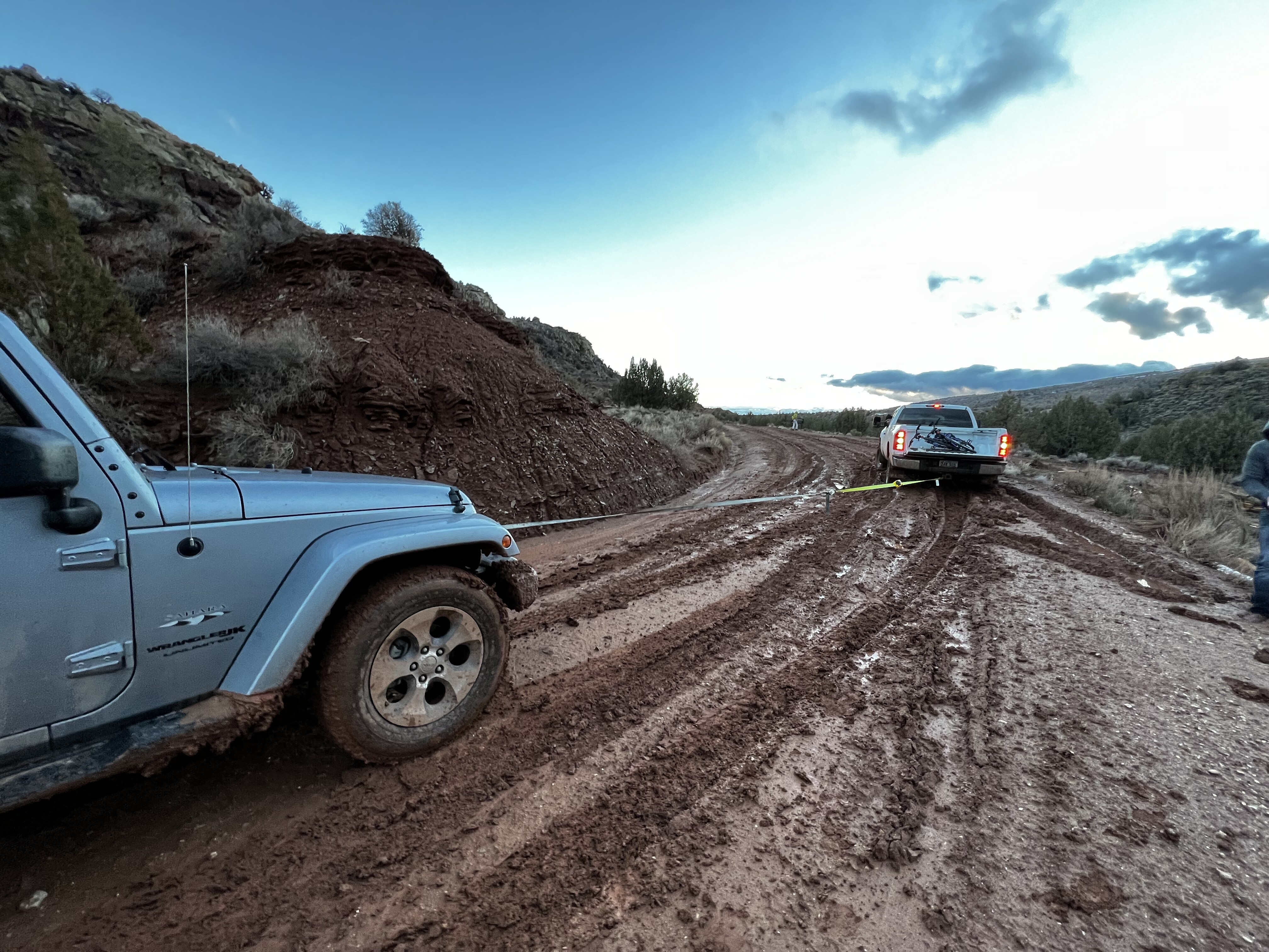 返程发现之前的小河变得更宽更深,而且河岸沉积了厚厚的泥巴,我们决定向南绕远路。南面没有河,但路况要更加泥泞。我们以外有两队人马的皮卡都陷进去了,发善心帮一辆陷得不是太深的皮卡脱险,牧马人四两拨千斤