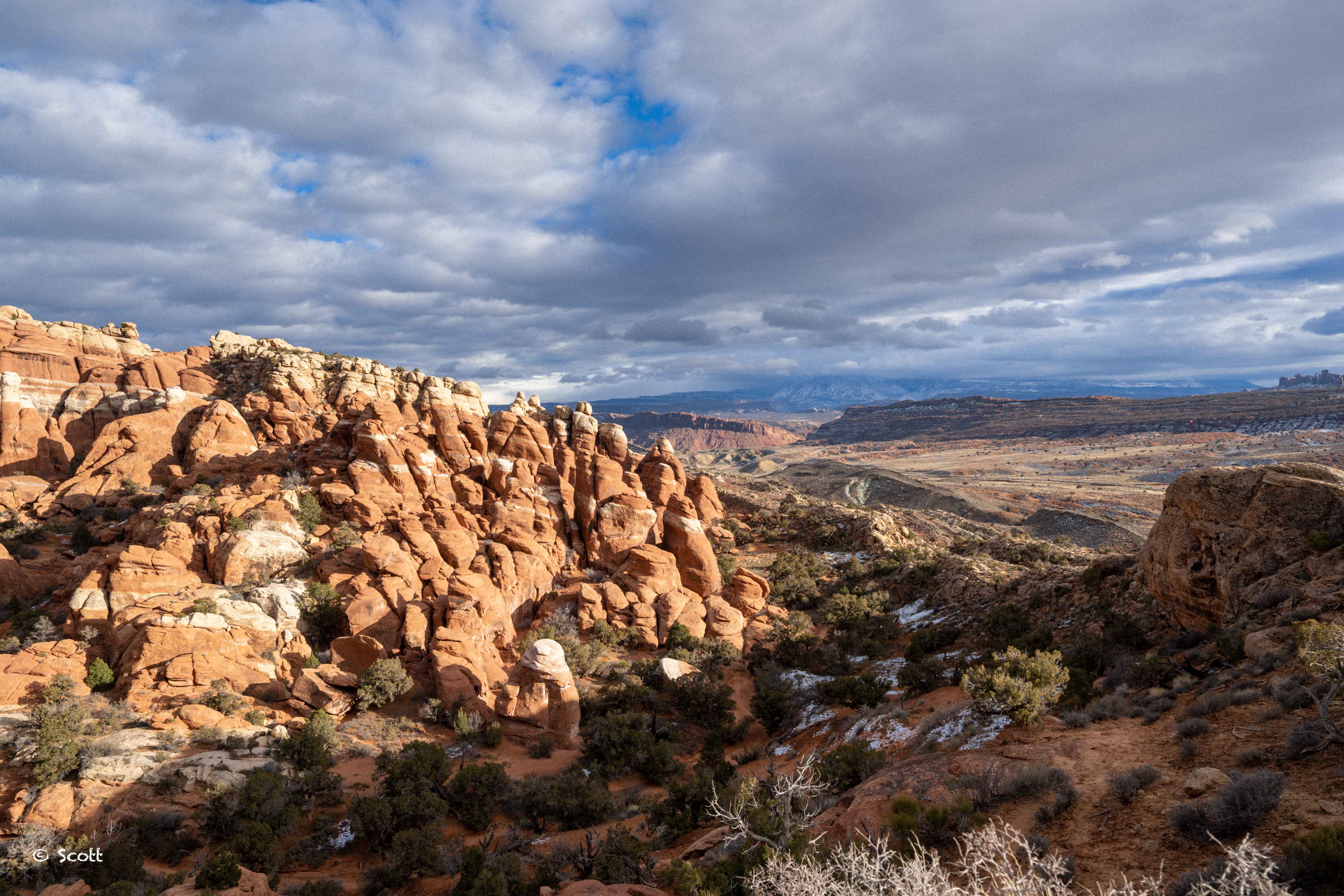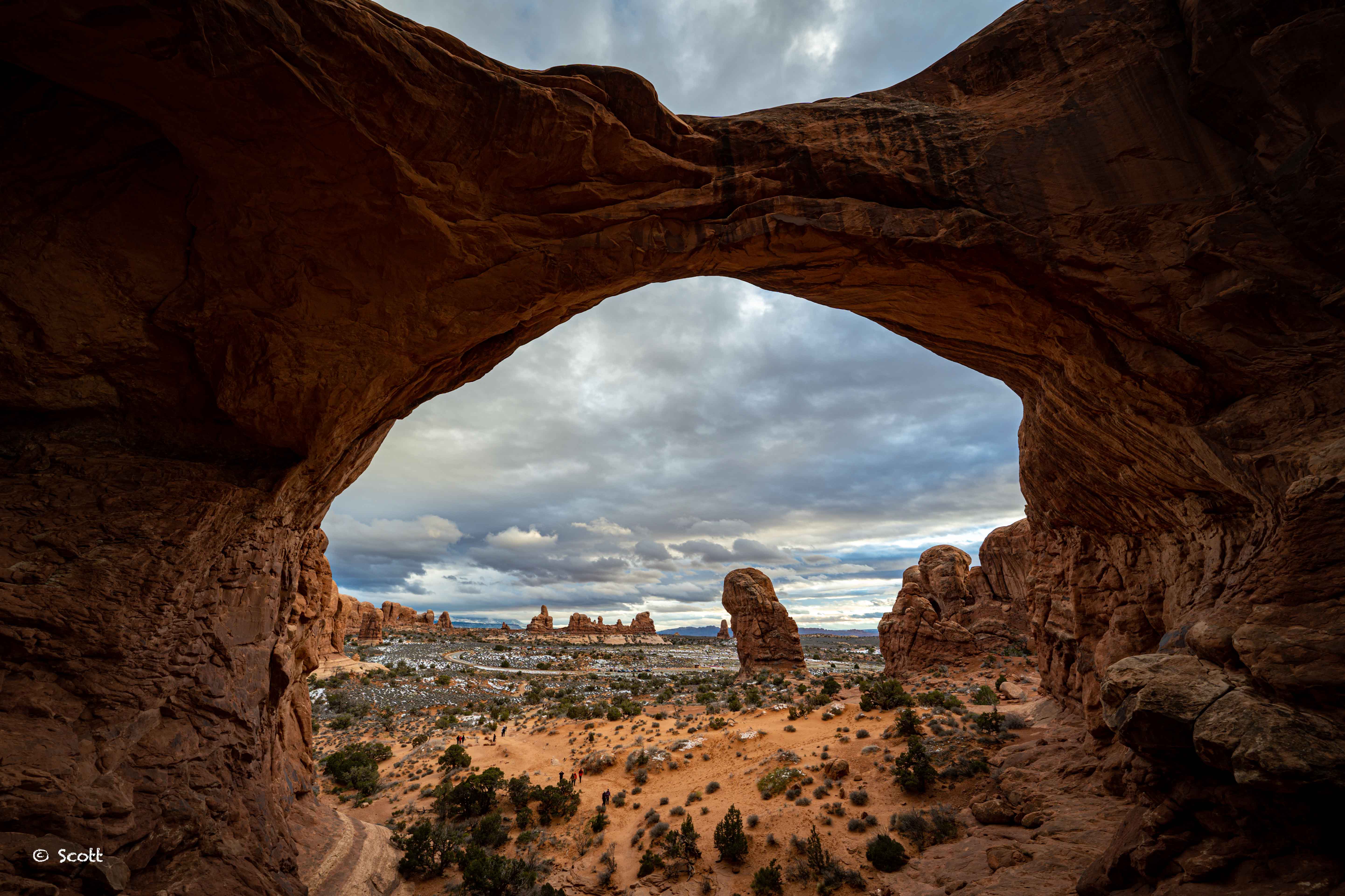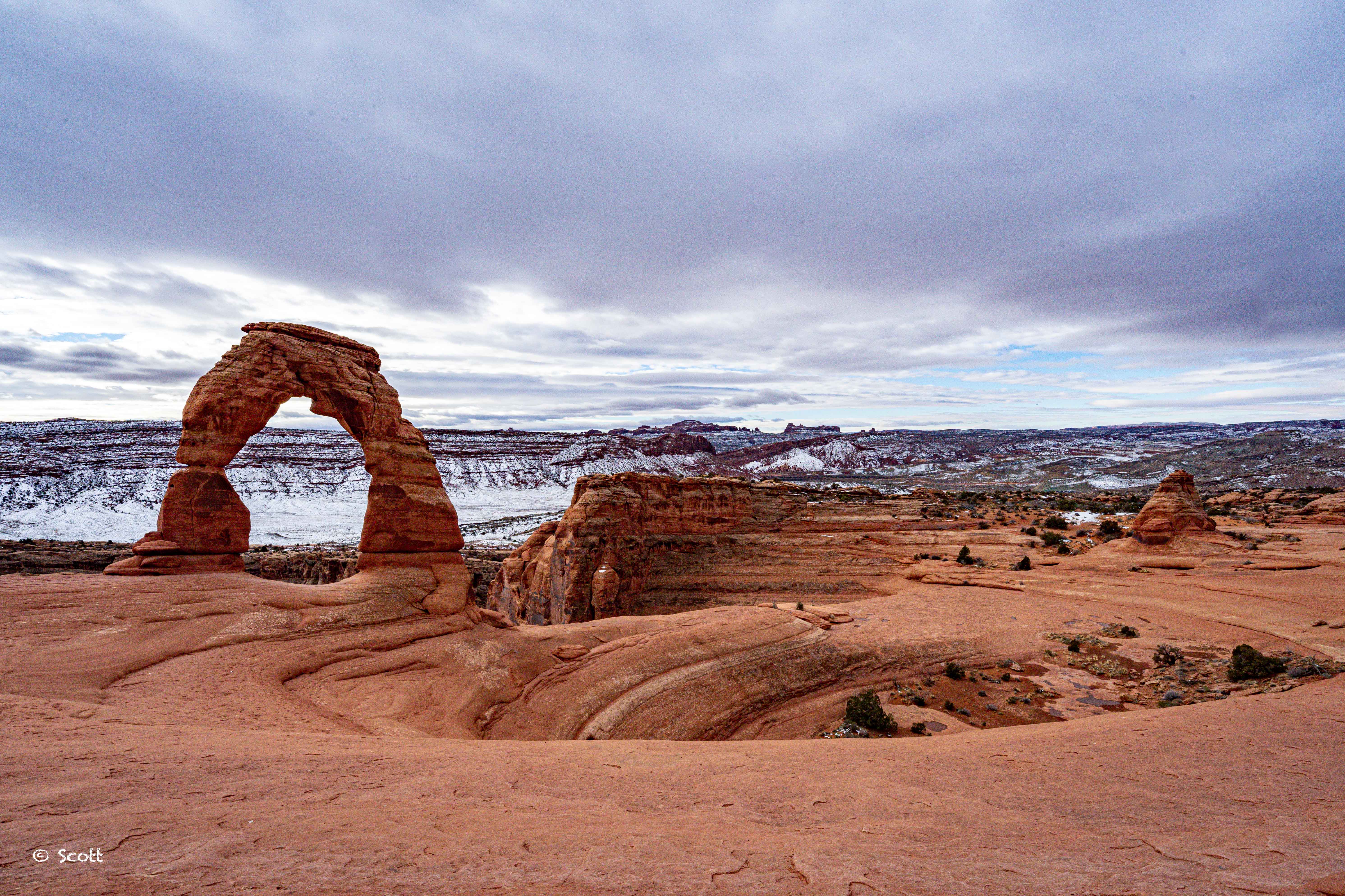 Delicate Arch 很像是游戏中通往异次元世界的大门,我们赶上了拱门国家公园下雪,但去的时候狂风呼啸,Delicate Arch 上没能留下积雪,算是个小遗憾。到 Delicate Arch 需要走一段往返3 miles moderate 难度的步道,我们大清早穿着spikes爬上来,到的时候基本没人,但正好看到一对新人在拱门下求婚成功,老叔叔又相信爱情了 ![]()