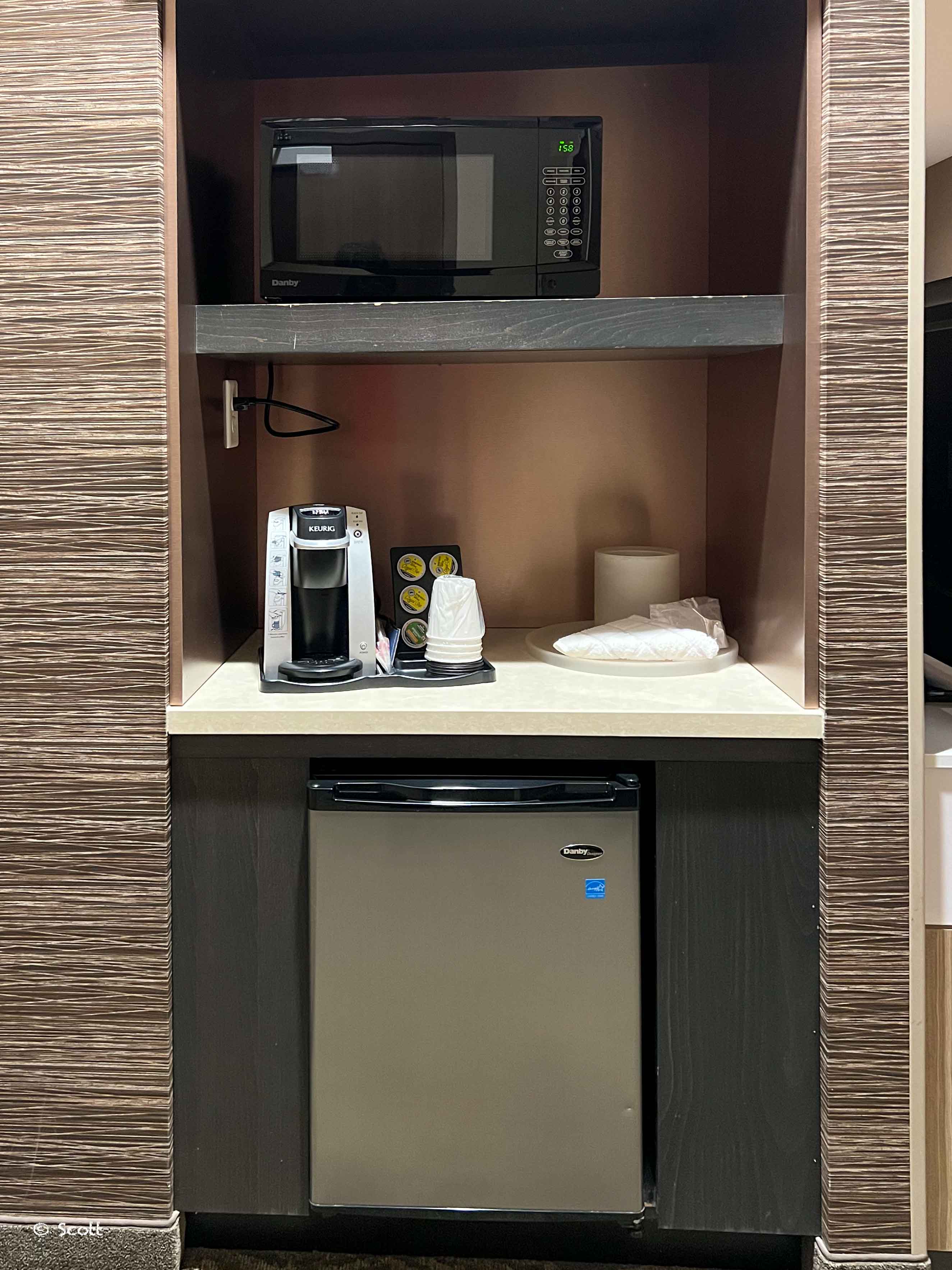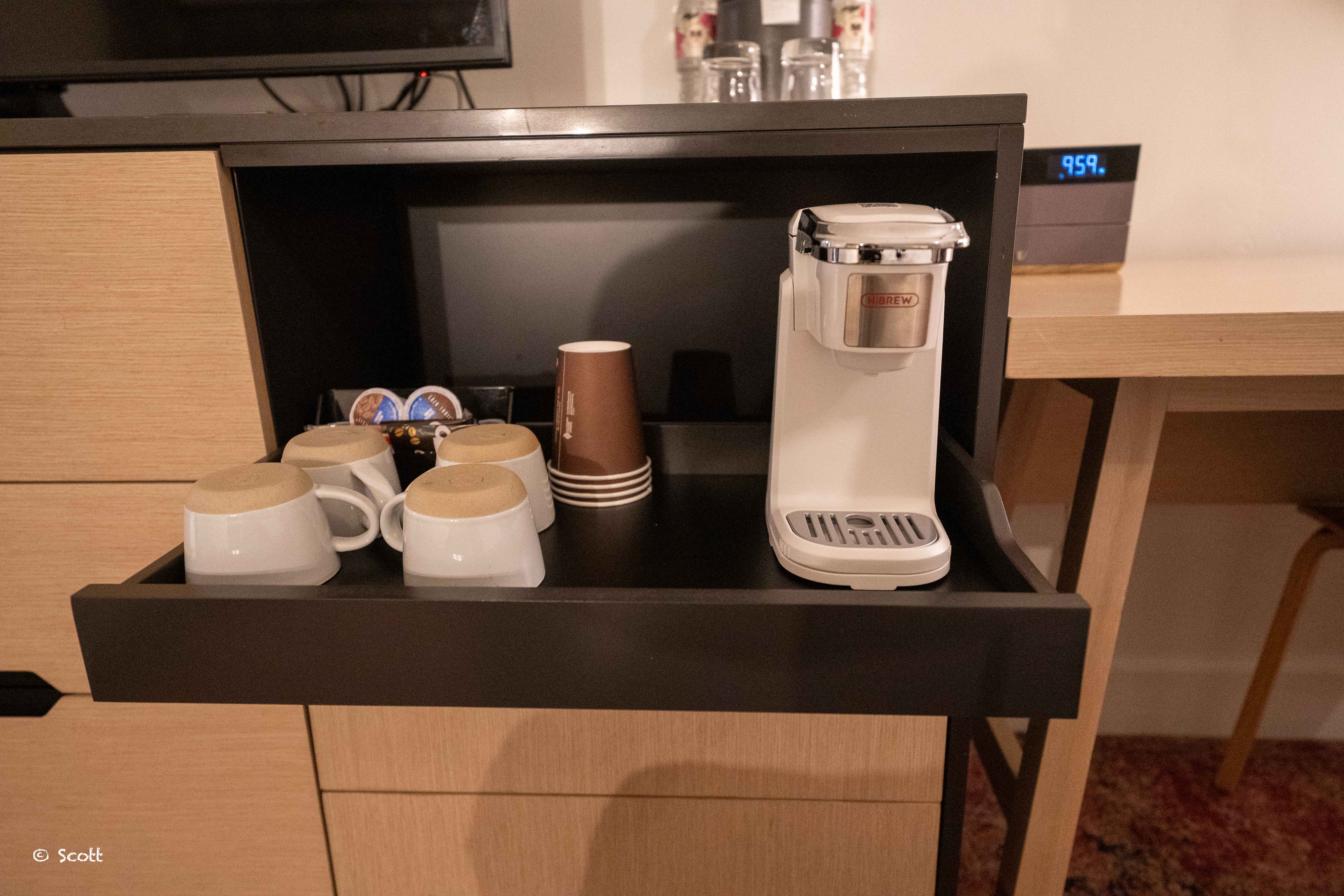 房间里的设施中规中矩,微波炉、冰箱、咖啡机都有,收拾的非常整洁。