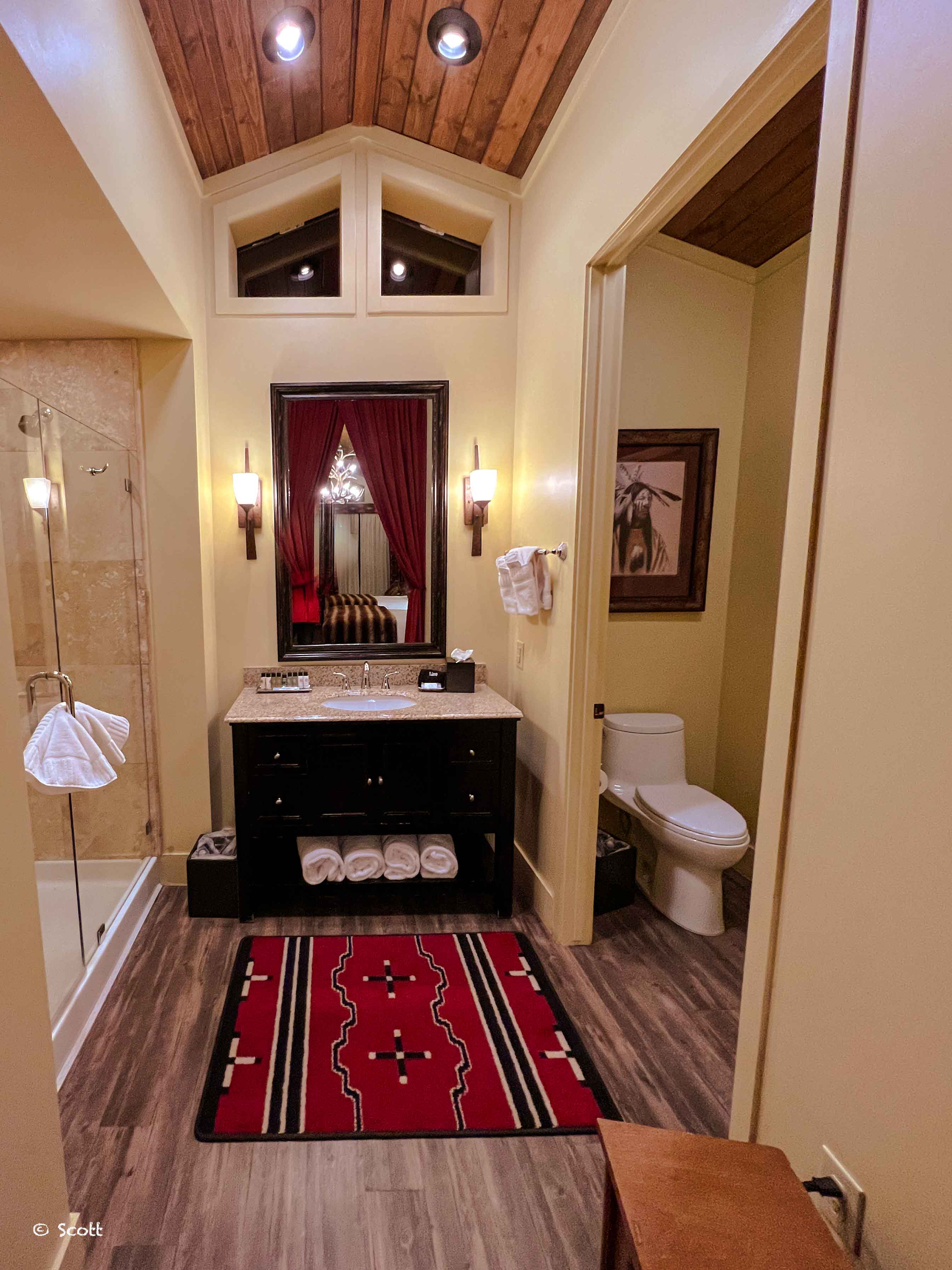 Capitol Reef国家公园附近貌似没有连锁酒店,concierge给我们预定了公园门口的Capitol Reef Resort,我们订了乞丐房上面一档的普通房间,一晚上$200不到,入住的时候逗前台小姐姐笑了笑,居然给升级到了独栋的cabin(这个当晚要$350+,是最好的双床房型),被这种local的酒店升级着实有些惊讶,不知道是concierge的功劳还和调戏良家小姐姐的功劳![]()