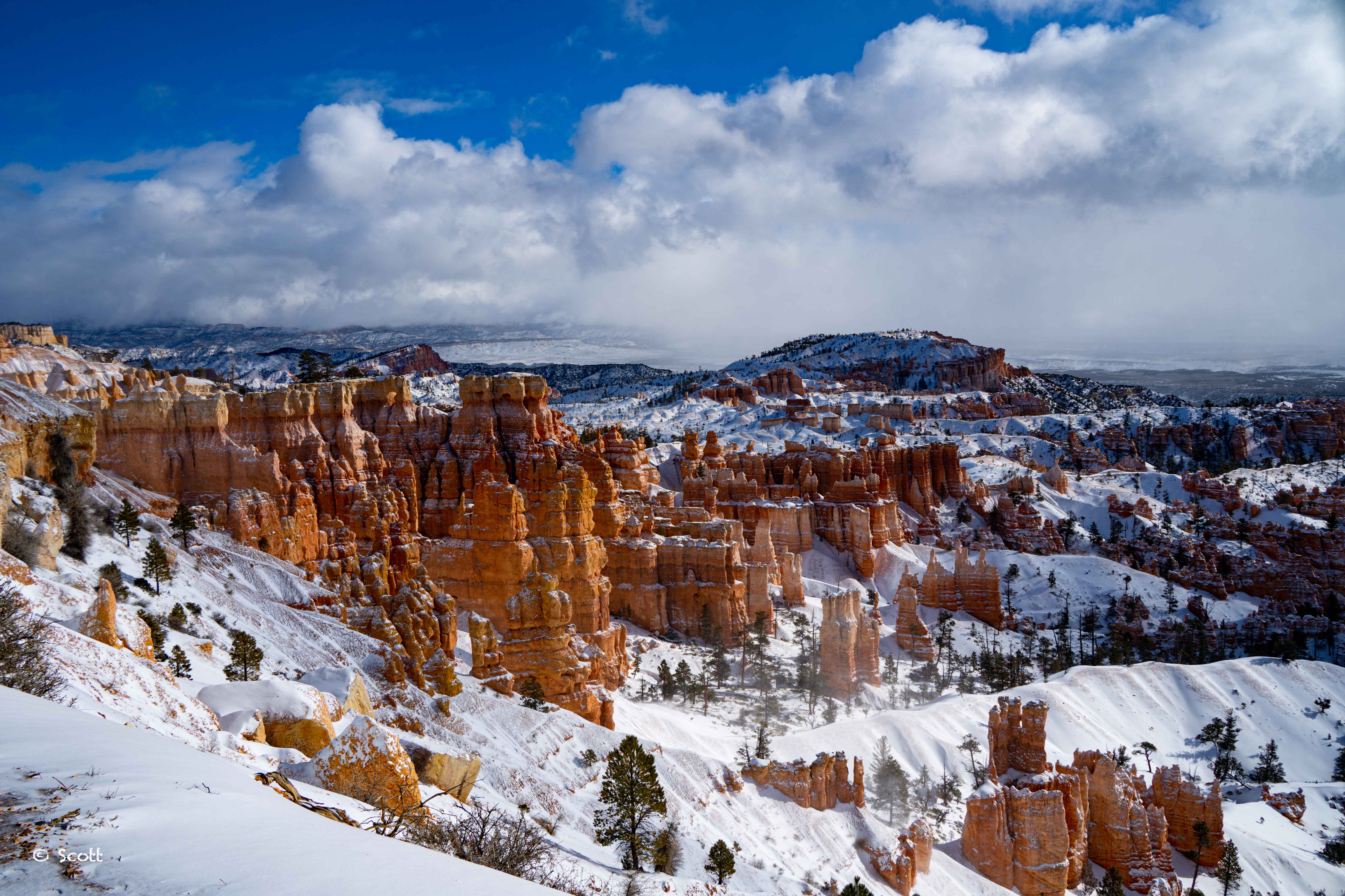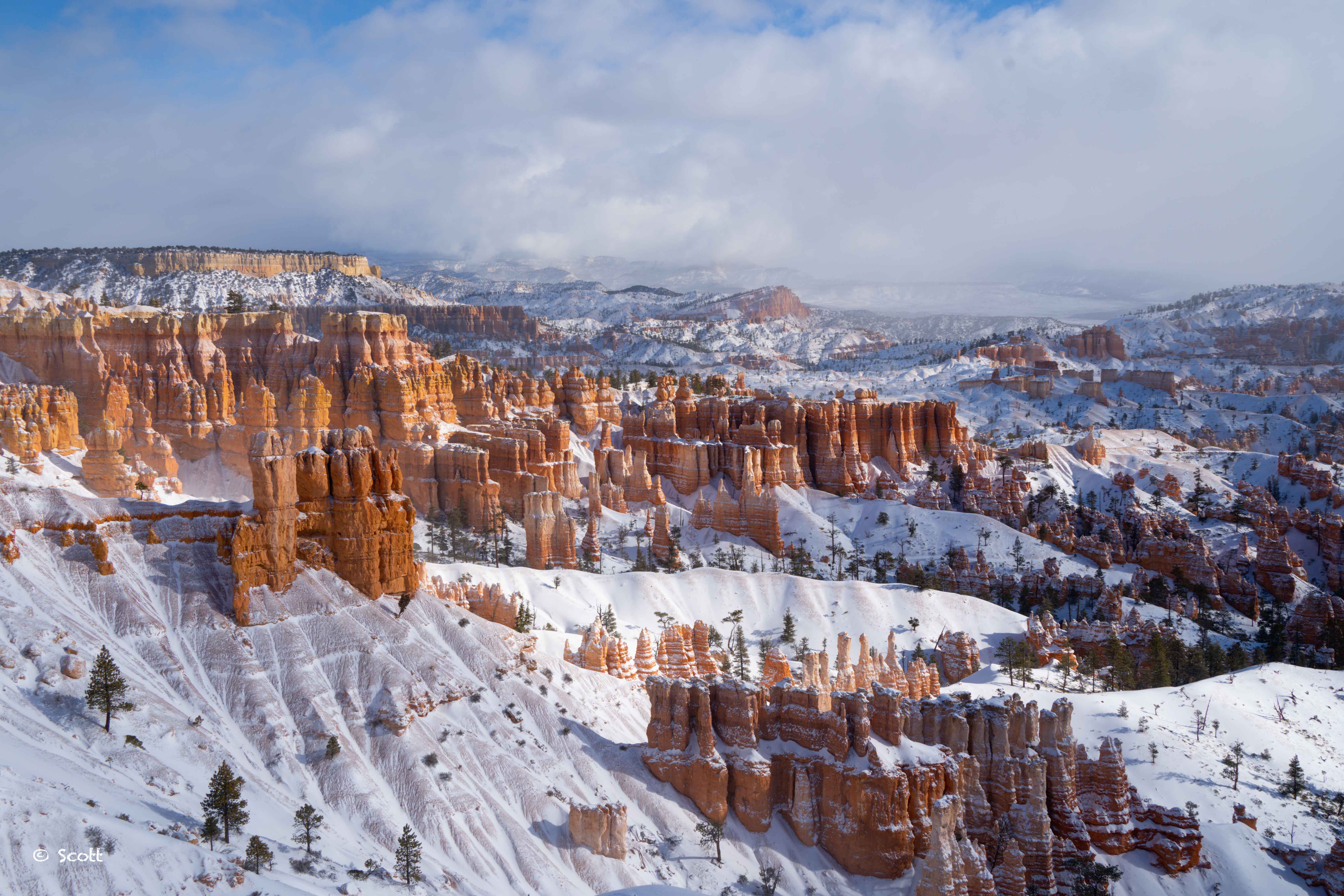 上下两图可以看到一大片积雨云慢慢散去,像打开天窗一样,露出雪后Bryce Canyon最美的景色。