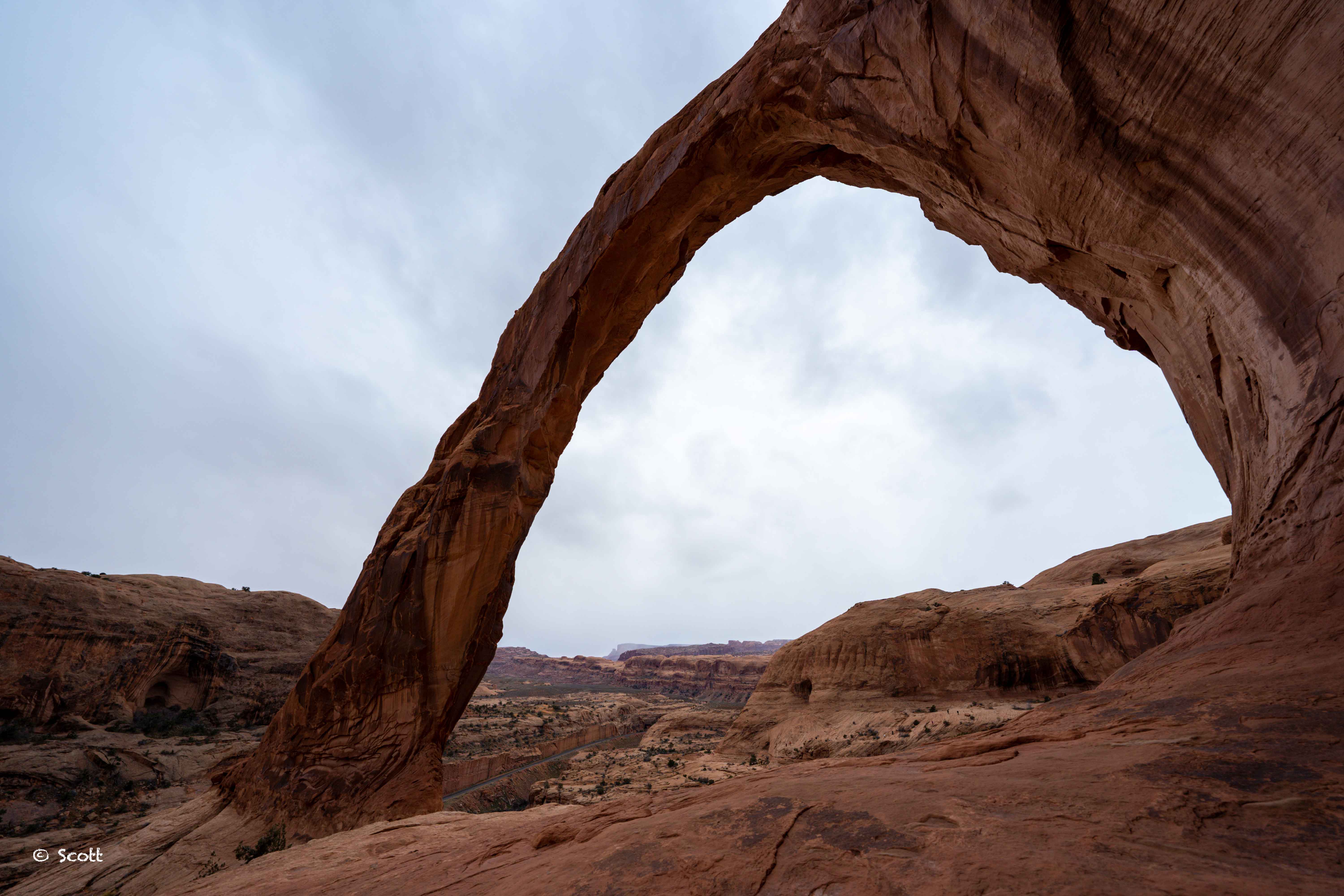Bowtie Arch(上图)& Corona Arch(下图)两个拱门紧挨着,走2.4miles往返一段moderate 的trail就能看见。Corona Arch是此行见过最大的斜跨式拱门,远远就能感到她的震撼。去这两个拱门的公路边上是Petroglyphs,能看到古印第安人在峭壁上画的壁画,这个停车扫一眼就好,很像小孩子的涂鸦。