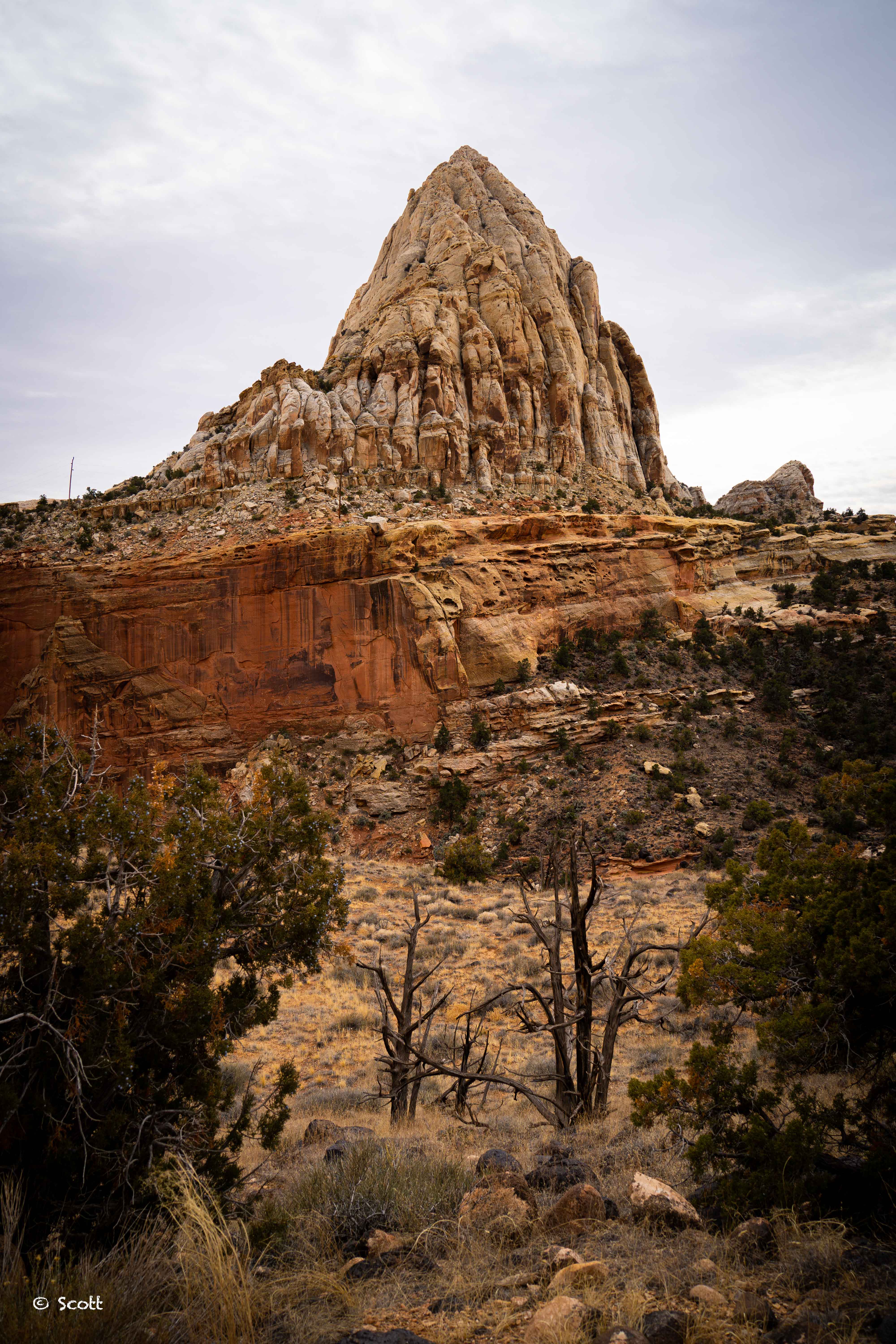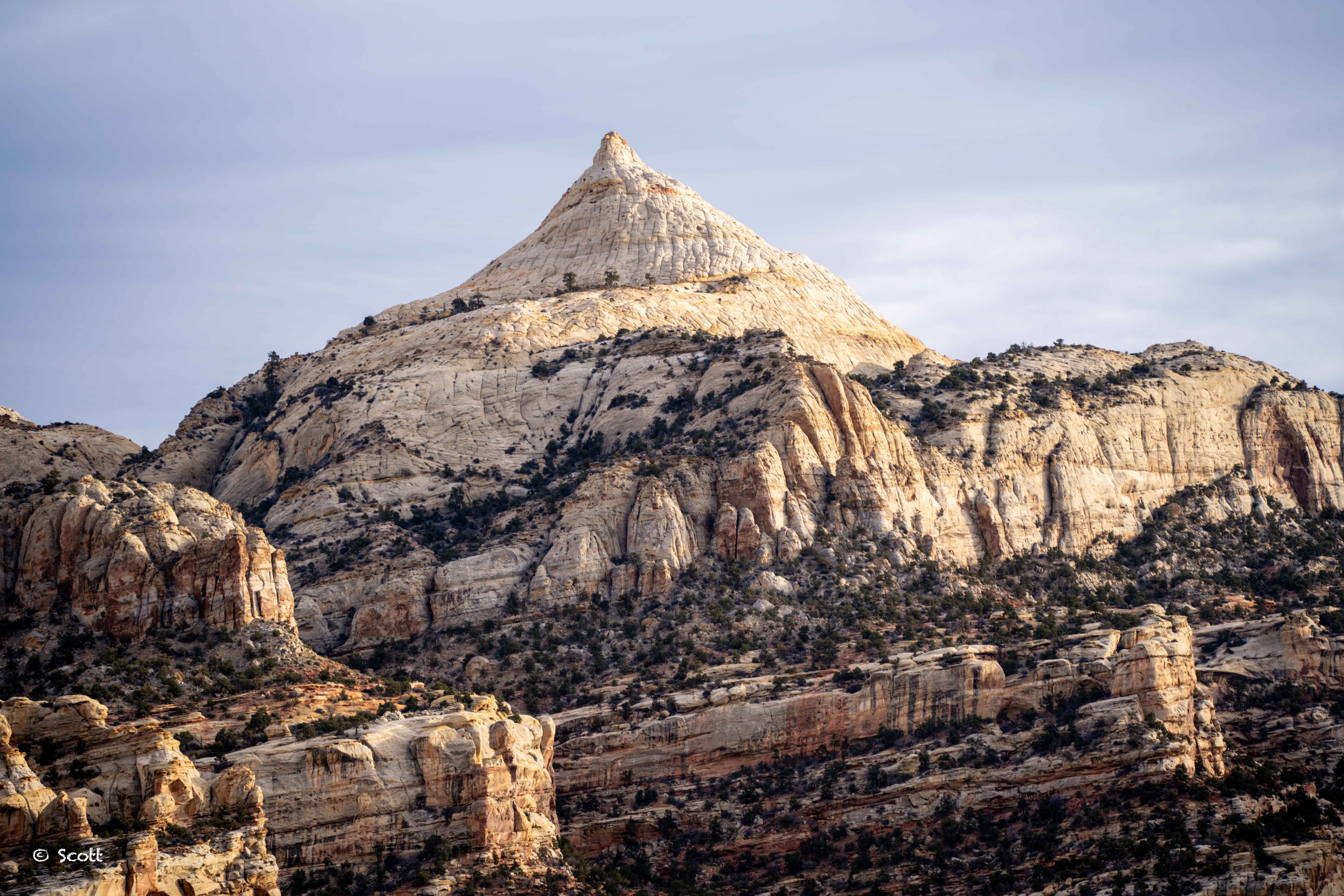 Capitol Reef 圆顶礁是因为下图这块岩石像国会大厦Capitol的圆顶而命名,不知为啥感觉不太像国会大厦圆顶,倒是更像裹着银白色锡纸的好时巧克力 ![]()