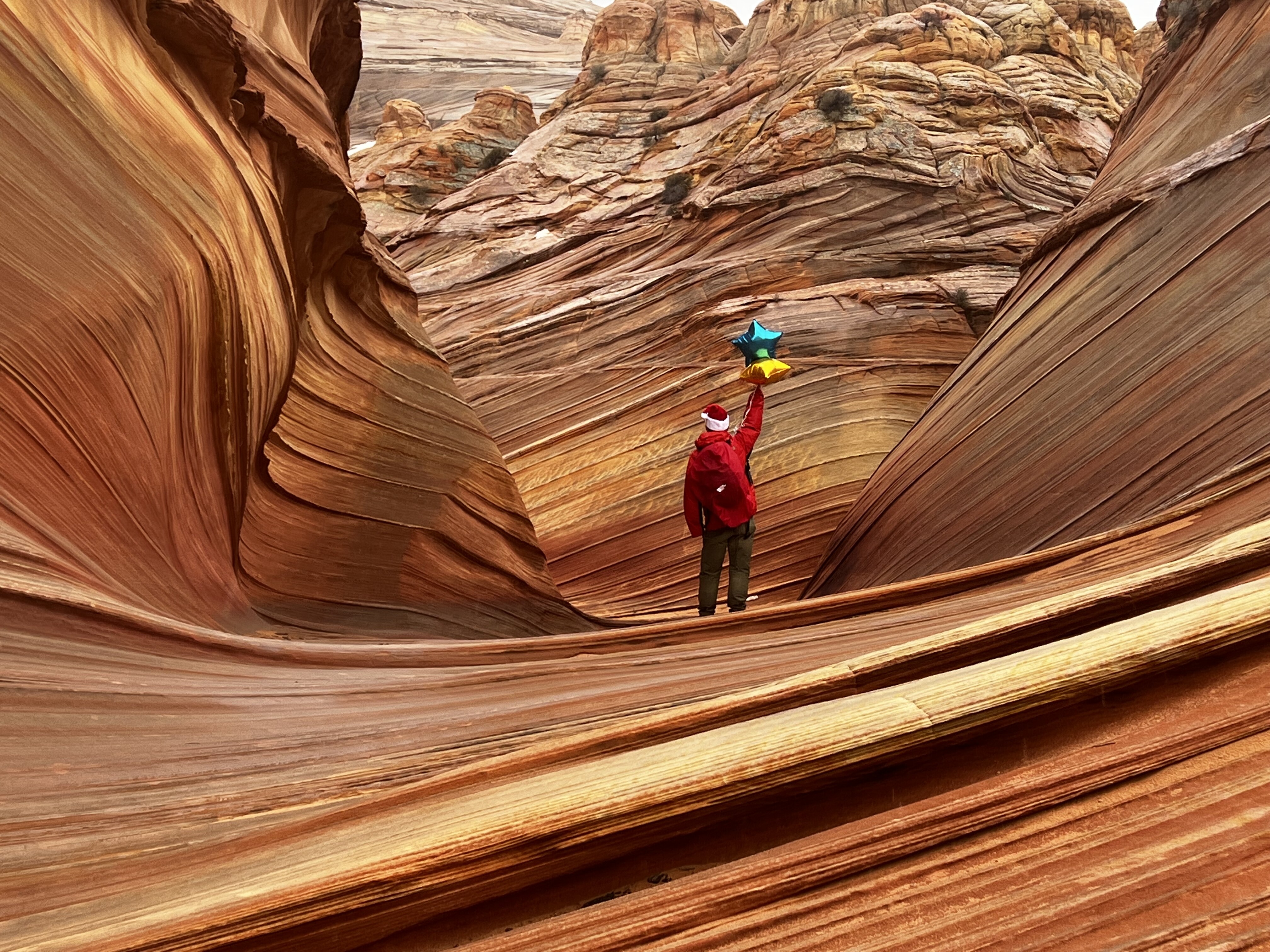 到波浪谷主谷 The First Wave和旁边The Second Wave是一段往返6.3 miles平日moderate难度的trail,当天是平安夜,但狂风暴雨,带着摄影和摆拍道具,完全可以算hard。我们拿着三个氢气球到波浪谷(一个半路被风吹飞了),然后戴上在一元店临时买的圣诞帽摆拍……旁边一对俄罗斯情侣一脸懵逼地看着我,我说:其实,我是个演员 ![]()