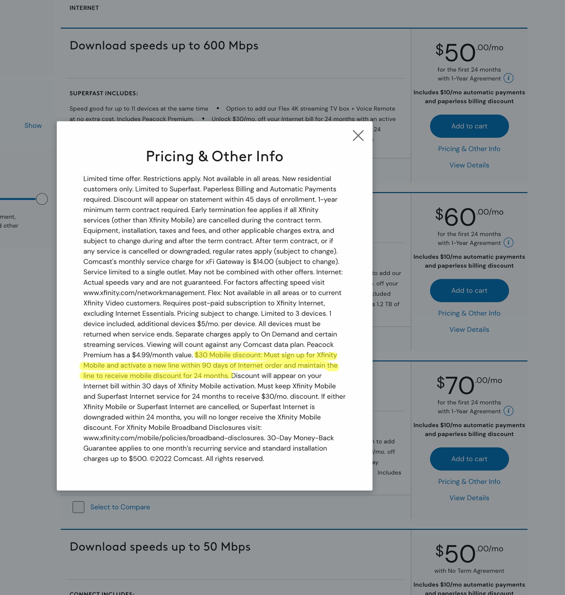 $30 Mobile discount: Must sign up for Xfinity Mobile and activate a new line within 90 days of Internet order and maintain the line to receive mobile discount for 24 months.