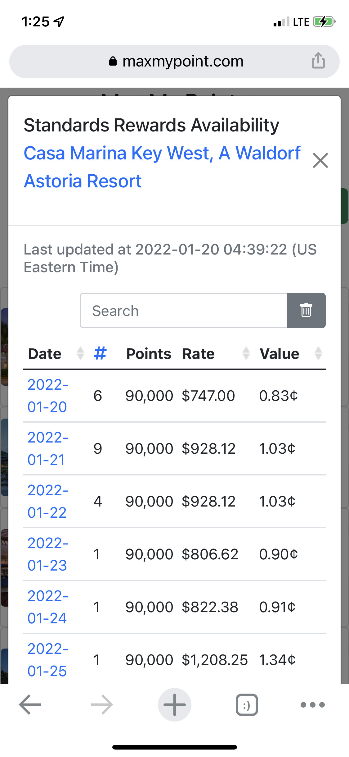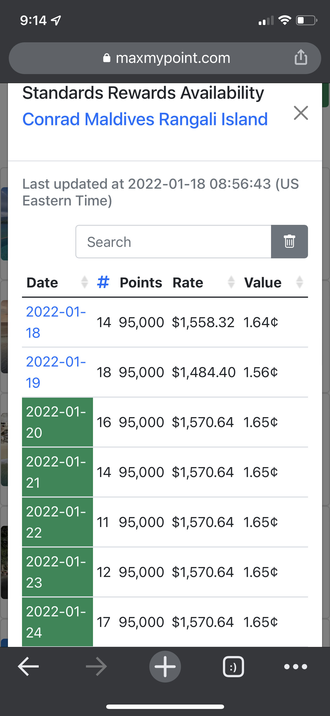 点击Conrad Maldives Rangali Island来查看接下来一年有标准房的日期。在表格的上方可以看信息的更新时间。这个列表有日期,standard award房间数量,需要的点数,官网价格(包含各种税费)以及相对应的点数价值。