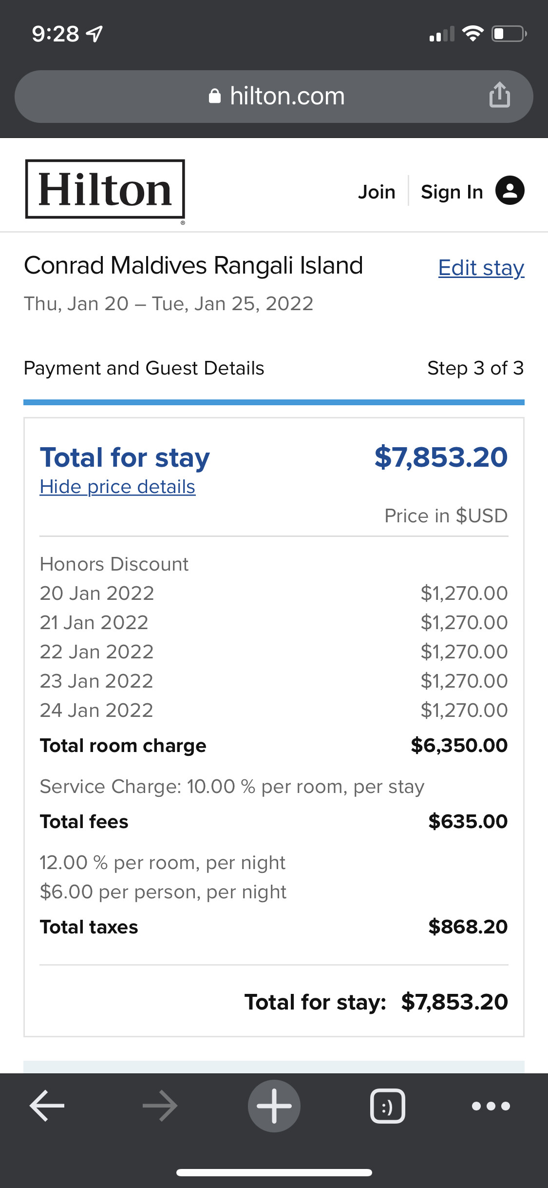如图中所示,查询结果显示1月20-24号都有点数房。根据4送1的兑换标准,这5天的住宿只要38万Hilton积分。同样的行程在官网的价格是$7,853.20(含税费),点数的价值可以达到每点2.07美分。这个价值是大部分网站希尔顿点数估值的3-5倍以上。(参考博客对希尔顿积分估值为0.4美分)