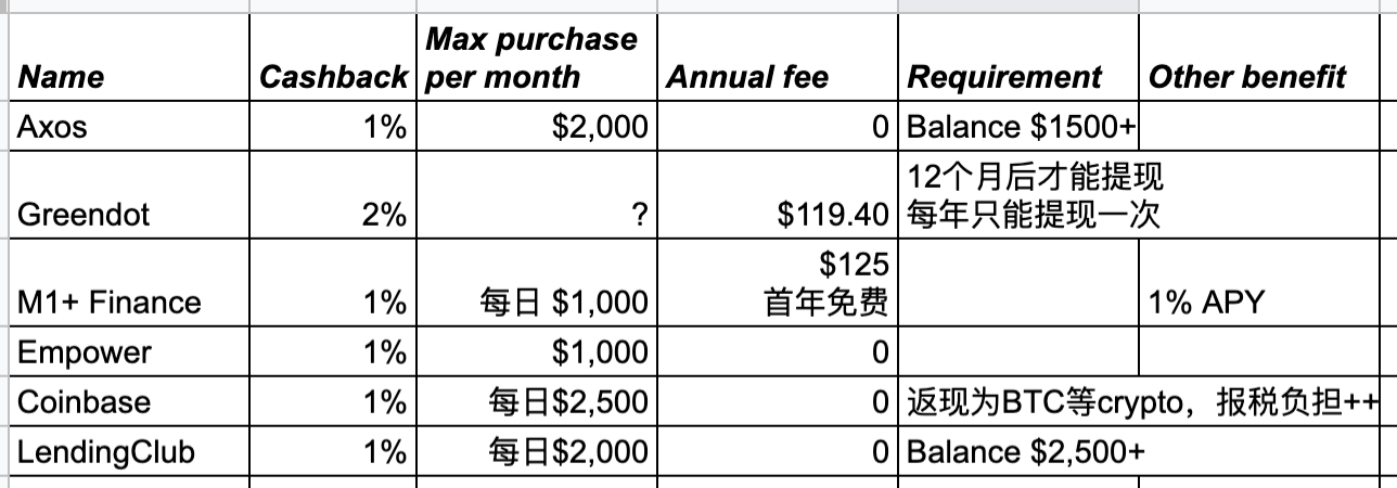 各个卡的申请限制(绿卡,地域),消费上限,返现上限麻烦看上了自己查一下吧。一起整理有点多。这个表显然也还非常sparse,希望大家回复提供更多dp。