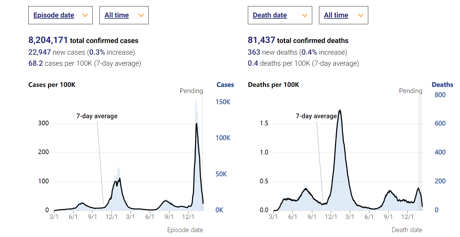 上面这个链接是污水中的病毒含量(受个人去不去测试被bias的可能性不大),收集到的数据显示的是目前已经过了peak。顶峰时4520copies/ml,现在已经下降到了530 copies/ml,下降接近8倍。