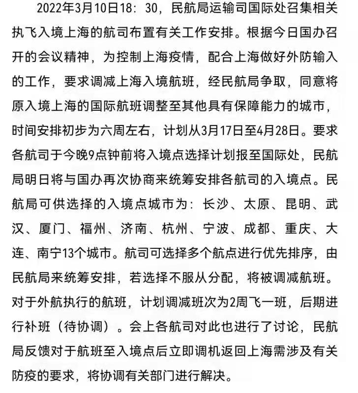 各位领导:因上海市防疫形势严峻,民航局召集航司开会决定:自2022年3月17日周四开始,所有入境上海的国际航班,更改至国内其它站点入境(民航局根据各航司提出需求再统一调配),为期6周。要求各航司对所辖入境航班向海外当地局方申请变更入境地点及航司提出落地城市的需求。