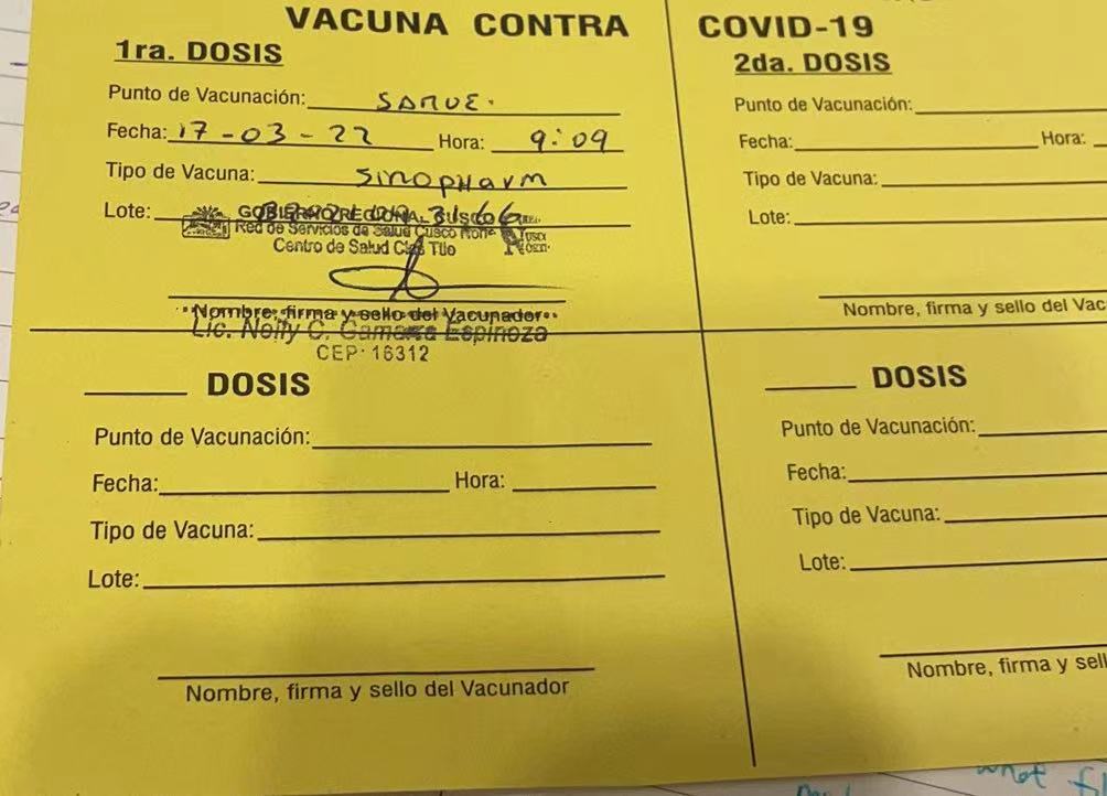 我又来了,之前发过一篇帖子讲自己打算去南美接种疫苗,不少人感兴趣,现在来提供DP。品牌的话,哥伦比亚是科兴,秘鲁是国药,墨西哥好像是科兴。我这趟三个国家各待一个月,上个月在哥伦比亚没打成,今天在秘鲁打了第一针国药sinopharm。