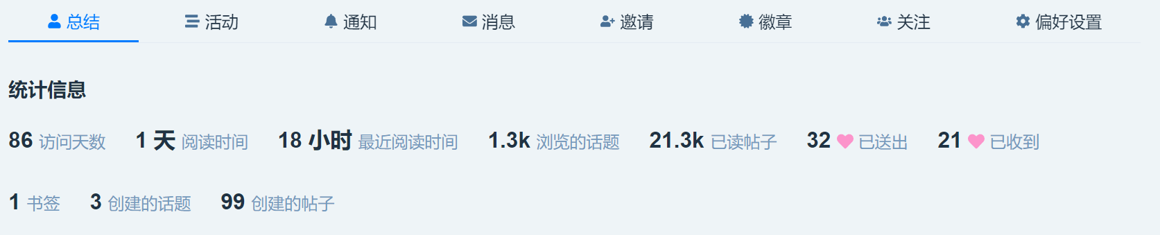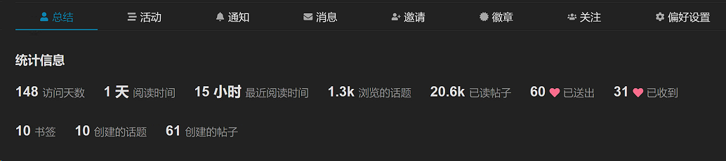点右上角自己的图标, 点个人资料,再点总结, 能看到你所有的点赞,送赞, 已读帖子数量,浏览帖子数量,访问天数。 这是从你建号开始的最新的所有统计。 如果你是从白金降级到金卡,想看最近100天内的统计就不好查了