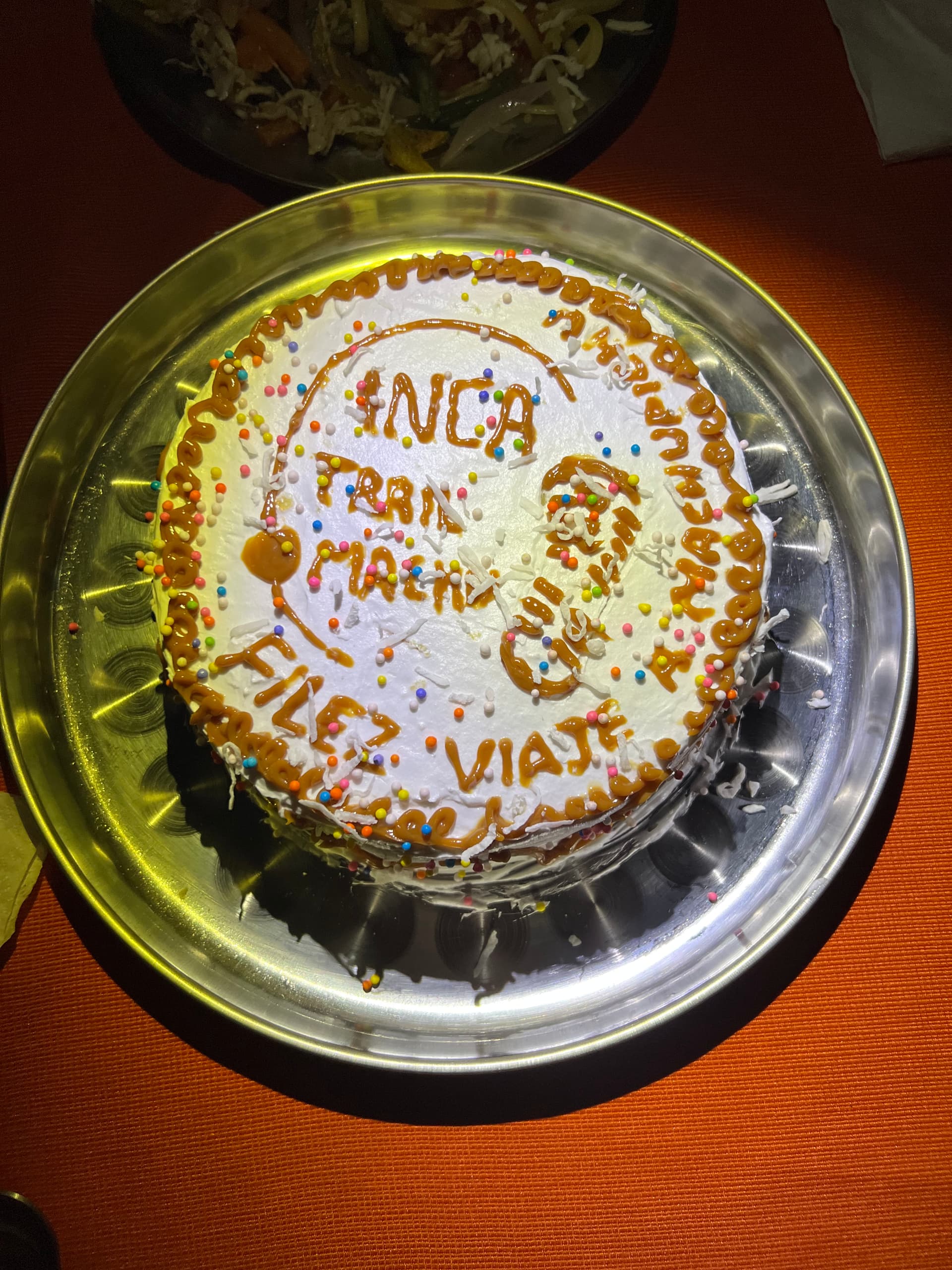 我们的秘鲁厨师在两个海拔3700多米的高原营地,愣是给做出了烤鱼排、煎草泥马排、炸鸡、牛肉炒饭、水果沙拉(含新鲜火龙果、草莓、木瓜、猕猴桃、无花果、蓝莓),焦糖朗姆香蕉… 最后的晚餐 literally 在海拔3700米的Phuyupatamarca营地给我们烤了个鲜奶蛋糕。。。(正常4天的团队大都在海拔2700米的地方扎营,烹饪难度完全不一样啊)