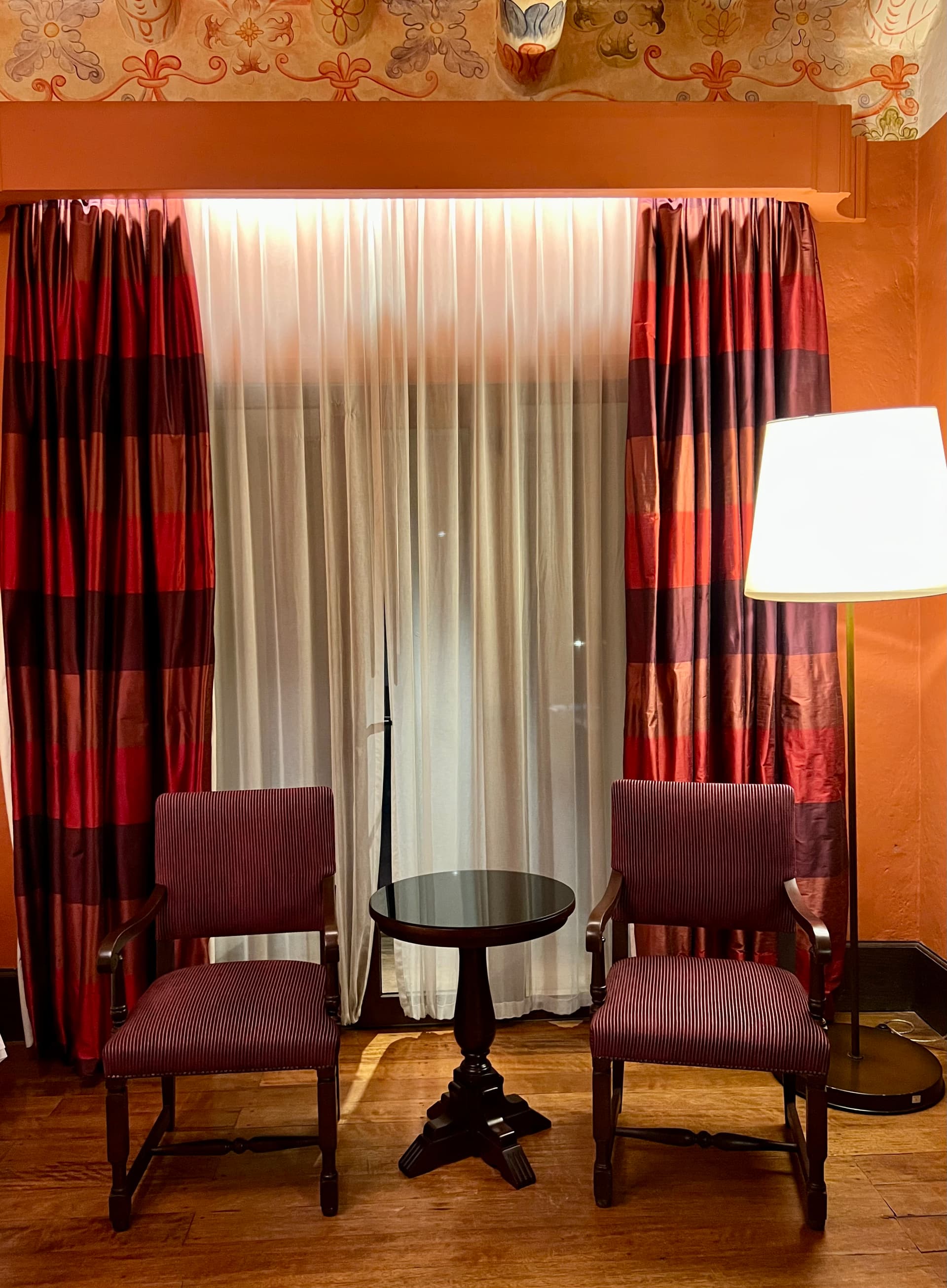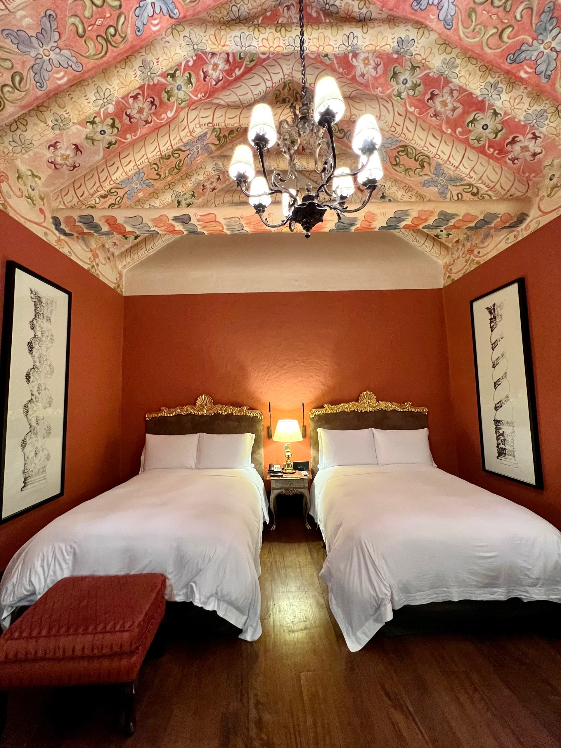 我们预定了乞丐房,用万豪套房券升到了imperial suite。这个套房名字起得比较大,但实际非常小…… 进门就是卧室连个客厅都没有,家具比较陈旧,木地板走起来咯吱响。员工也表示,这个房间最特殊的是天顶斗拱上的壁画…