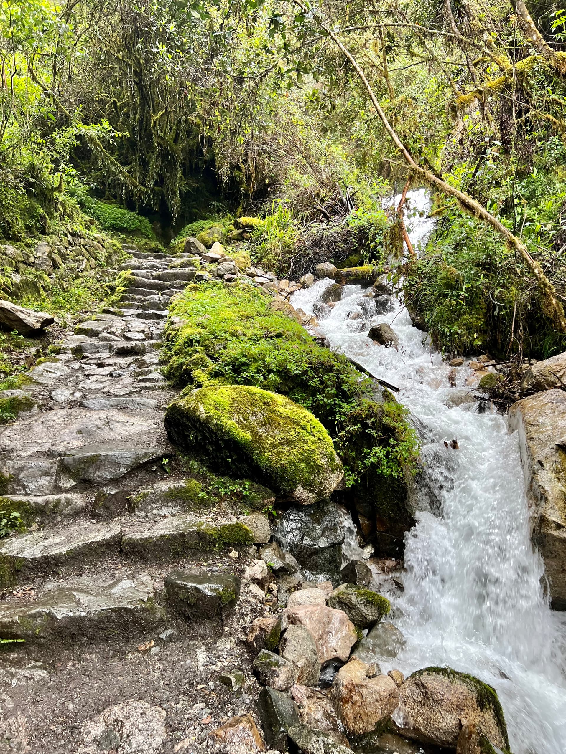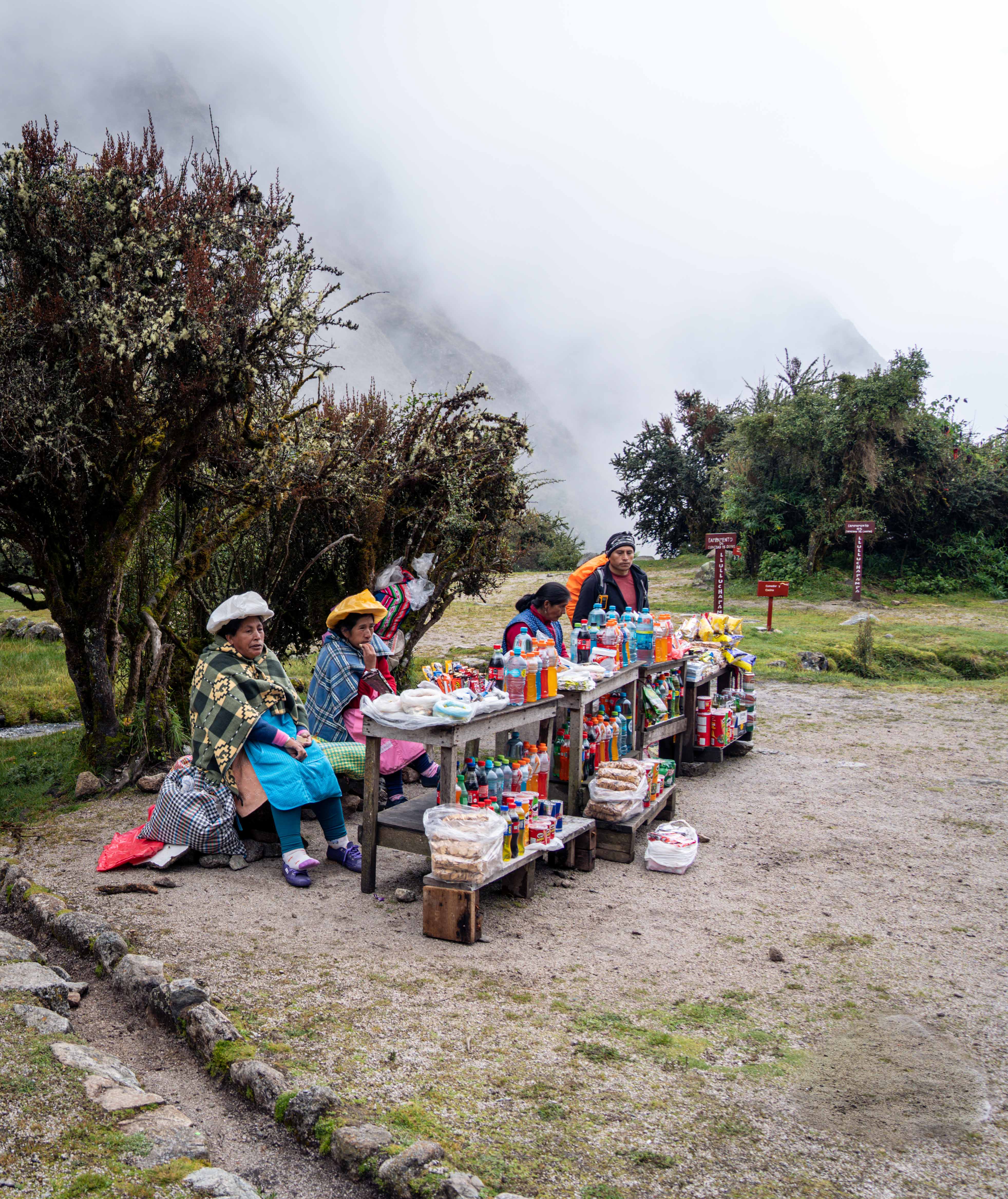 印加古道只有刚开始的1/3相对平缓,能看到一些印加人聚居区,甚至有当地人摆的小摊铺(和国内旅游很像),有牲畜出没,后2/3都是古老的石阶,马或骡子没法走,只能靠人背,类似泰山上的挑山工。每次休息结束,我们和向导先出发,chef 和 porter 收拾行李,然后在到下一个停靠点前超过我们,提前安营扎寨,我们每次抵达下一个营地时,团队成员都会整齐站在已经准备好的帐篷门口鼓掌欢迎