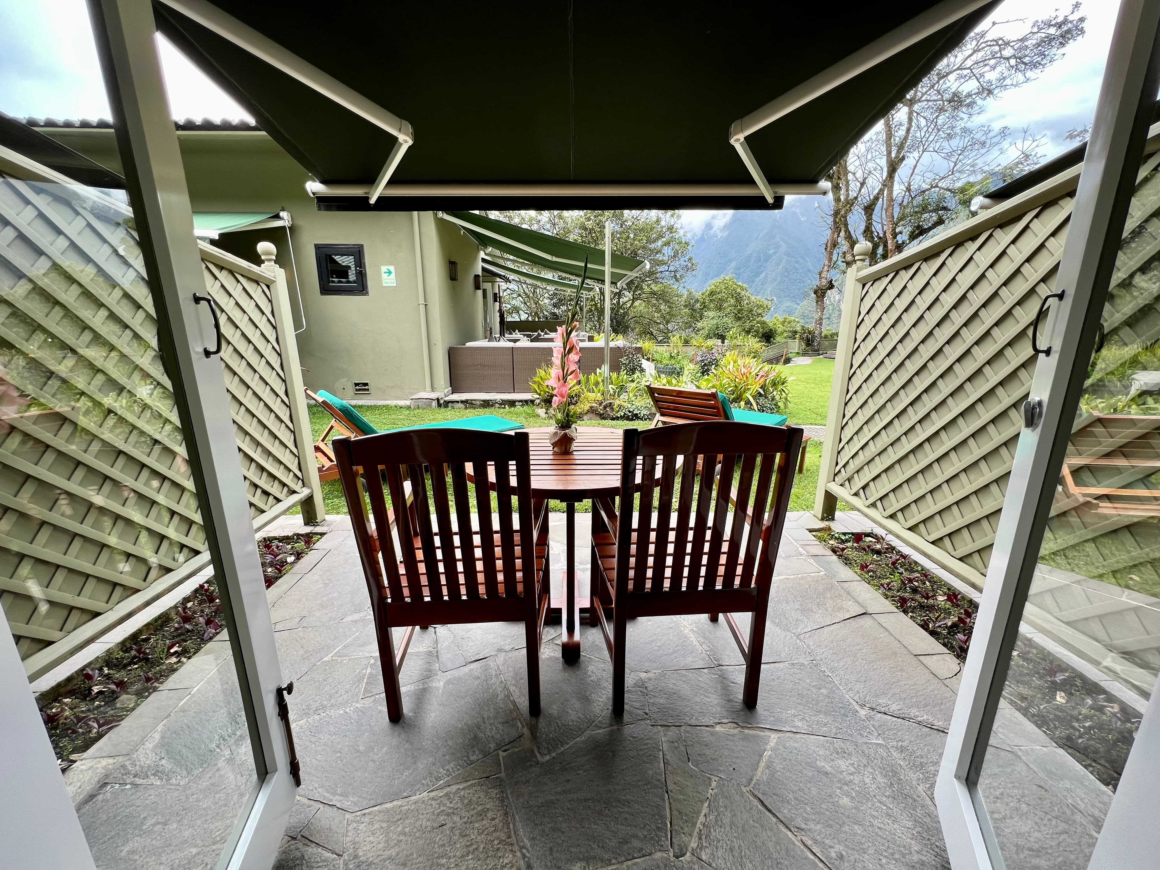 酒店好多地方都有鲜花装饰,推开卧室门就是Terrace,下雨时工作人员会提前把躺椅罩起来,对于在山里爬了三天的我们,晒个太阳不要太爽