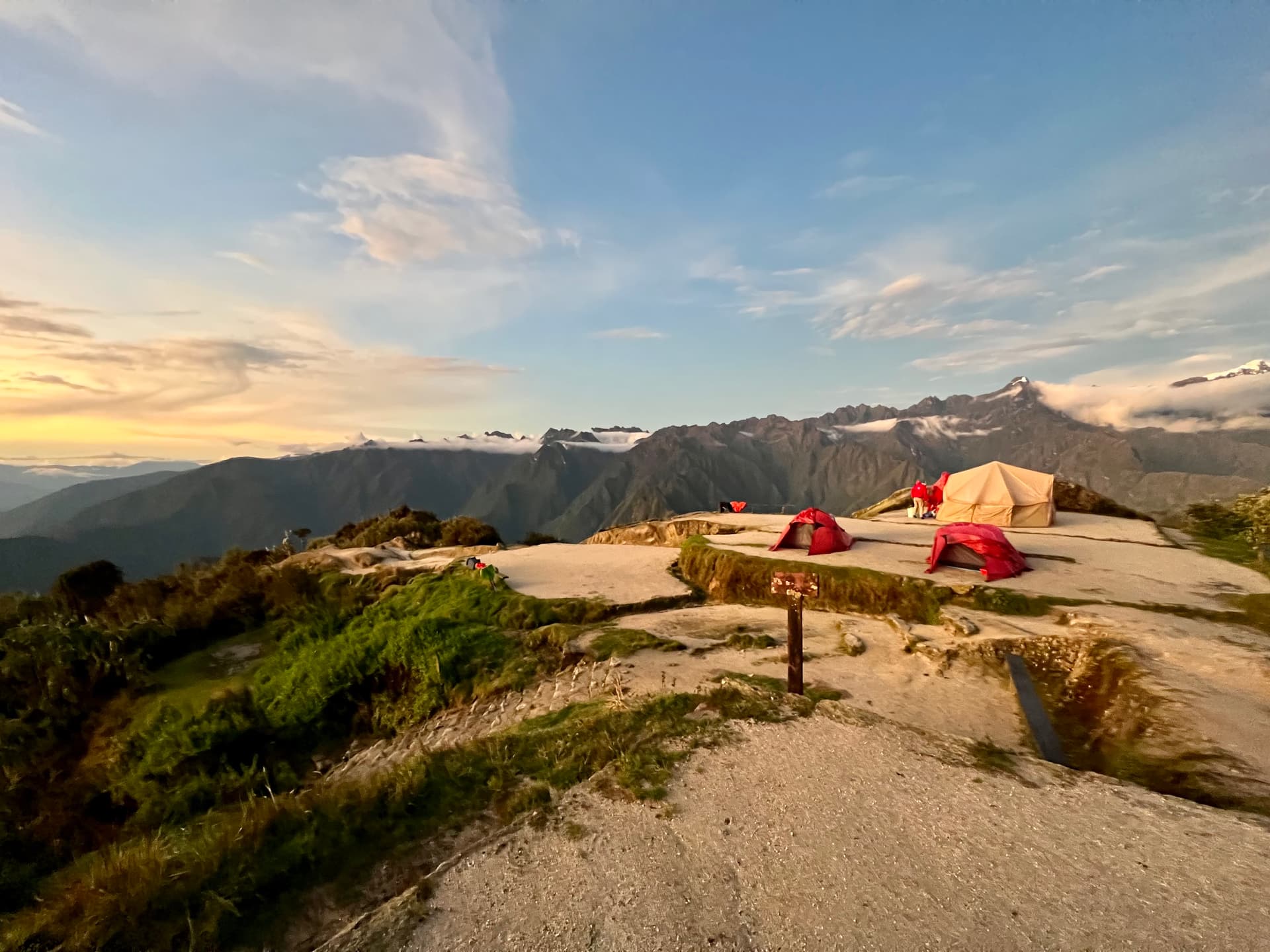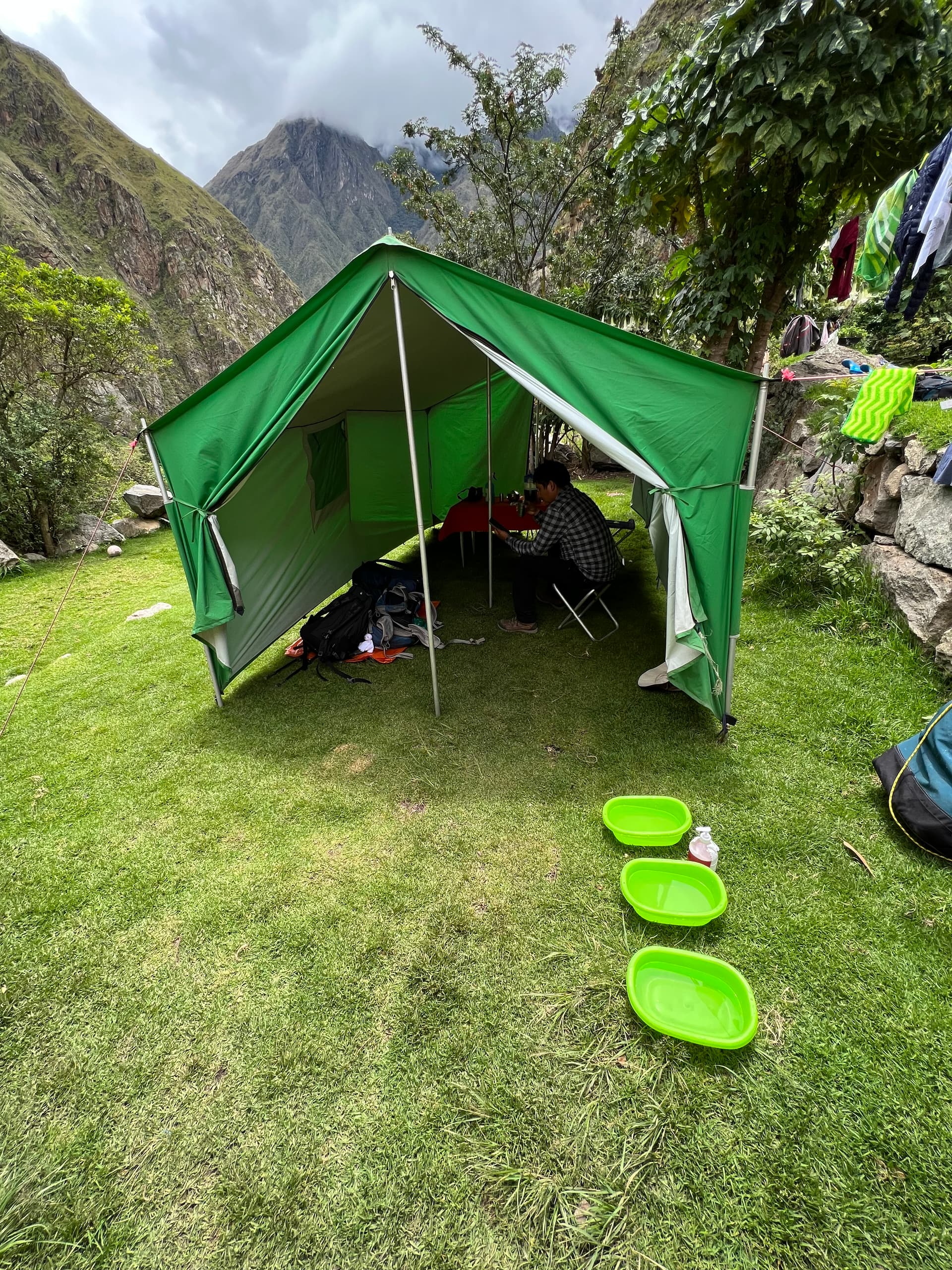 官方的通行证分为4/5/6天,大多数旅行团由8-15名游客组成。LZ和朋友算是时间紧但体力还好的背包客,连续失联4天实在无法忍受,加上近期covid变种肆虐,就尝试联系了 centurion conceige,搞到3天走完印加古道的特殊通行证,而且为我们俩安排了私人团队和最好的campsite(上图是对比普通4天团和我们3天行程的地图)。连中午吃饭的帐篷前面都有个小草坪 ![]()