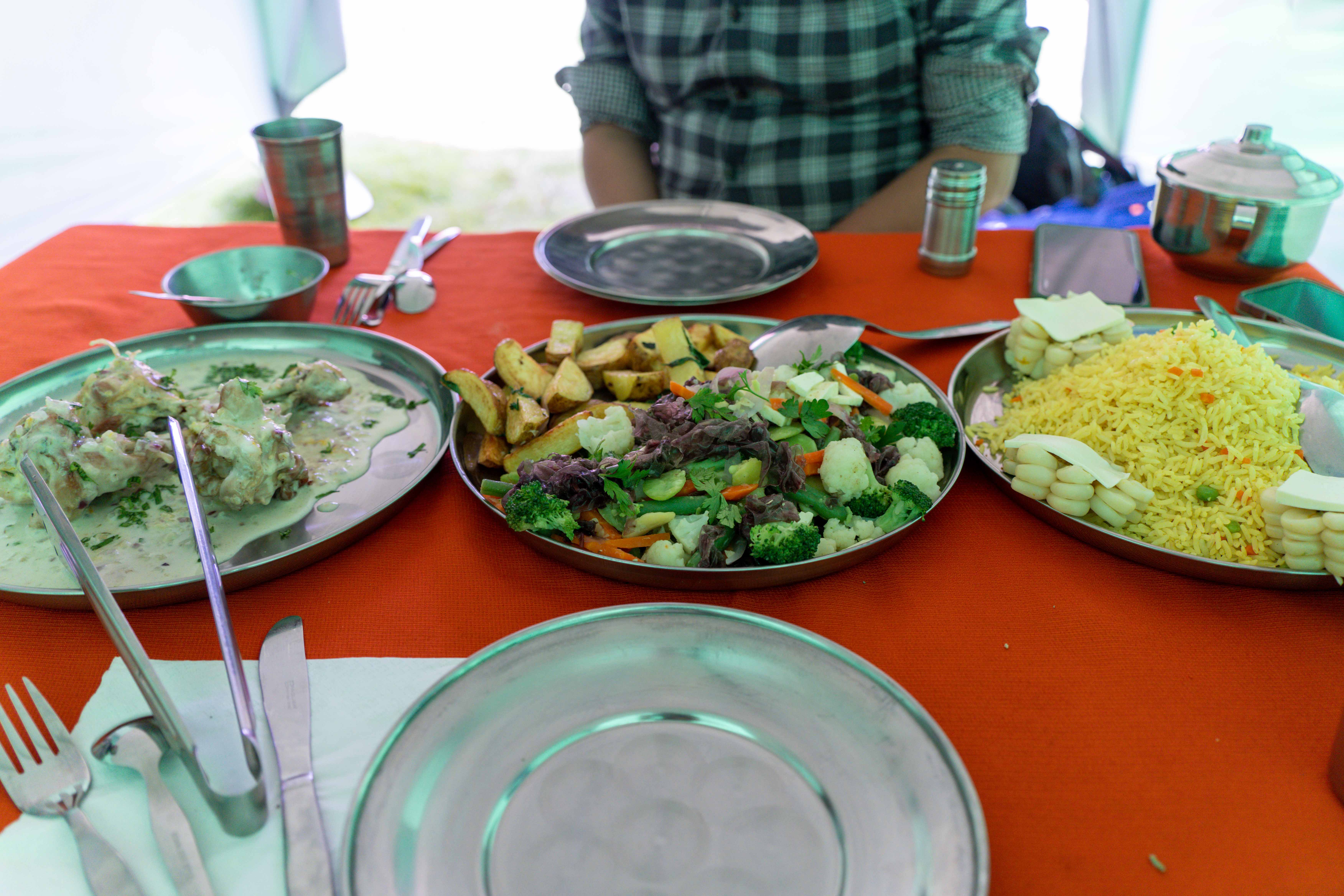 Guide沿途都紧跟着我们,给我们介绍一些历史故事和讲笑话,一直随身背着5kg氧气和一些应急药物;Porter要背的东西很多,除了正常camping会用的帐篷、睡袋、睡垫、滤水器这些,还包括煤气罐、炊具、洗具、餐具、杯具、折叠桌椅和一个移动厕所。我们每人还可以给porter 7kg的行李,比如三脚架就交给porter了。