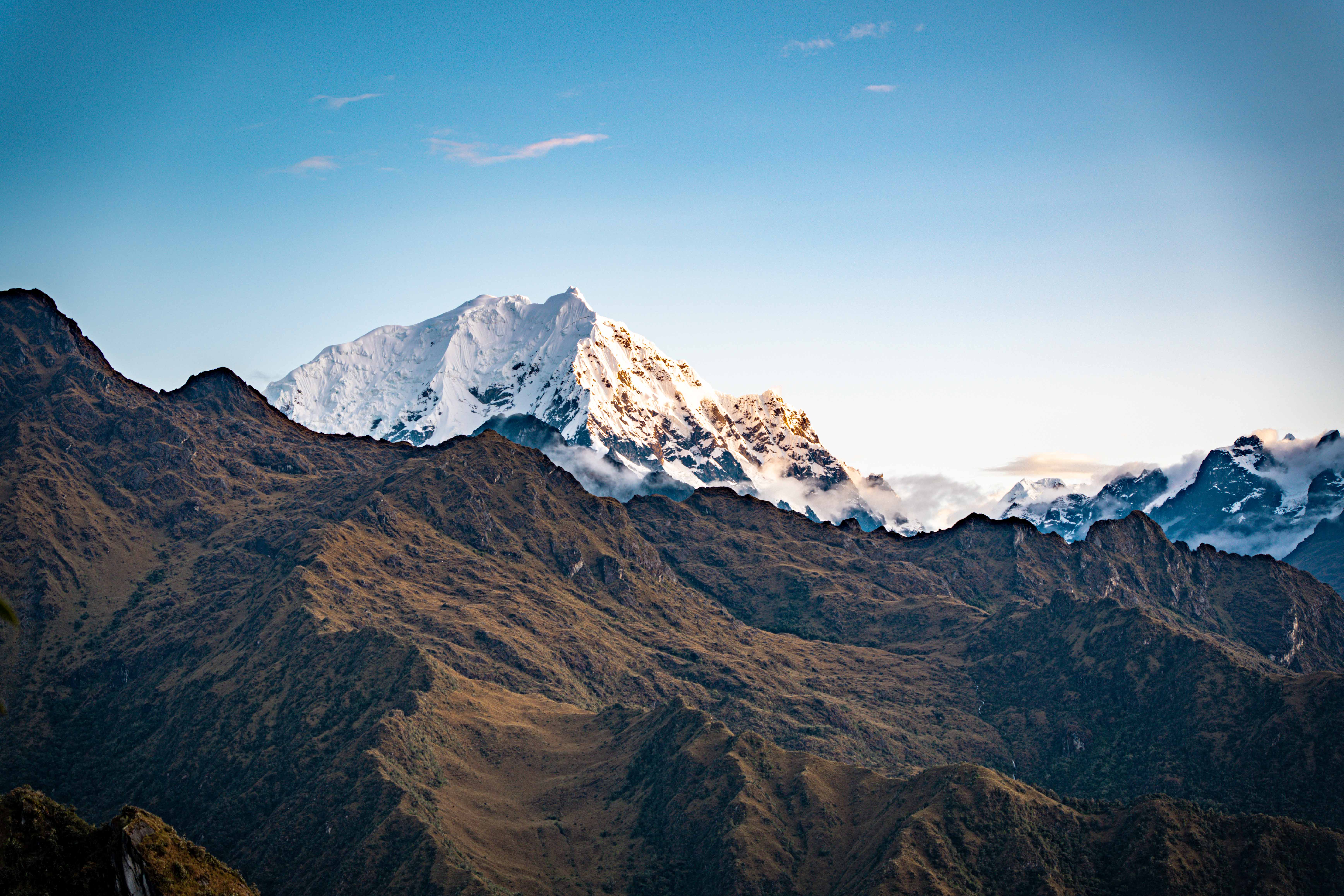 快要走到第二天营地的时候,我们意外看到了库斯科一带的最高峰,海拔6270m的印加神山Salcantay雪山,这座雪山山顶一年90%以上的时间都在厚厚的云层里,能看到晚霞照耀在Salcantay雪山上真是非常幸运(弥补了没看到安地斯神鹰的遗憾)。