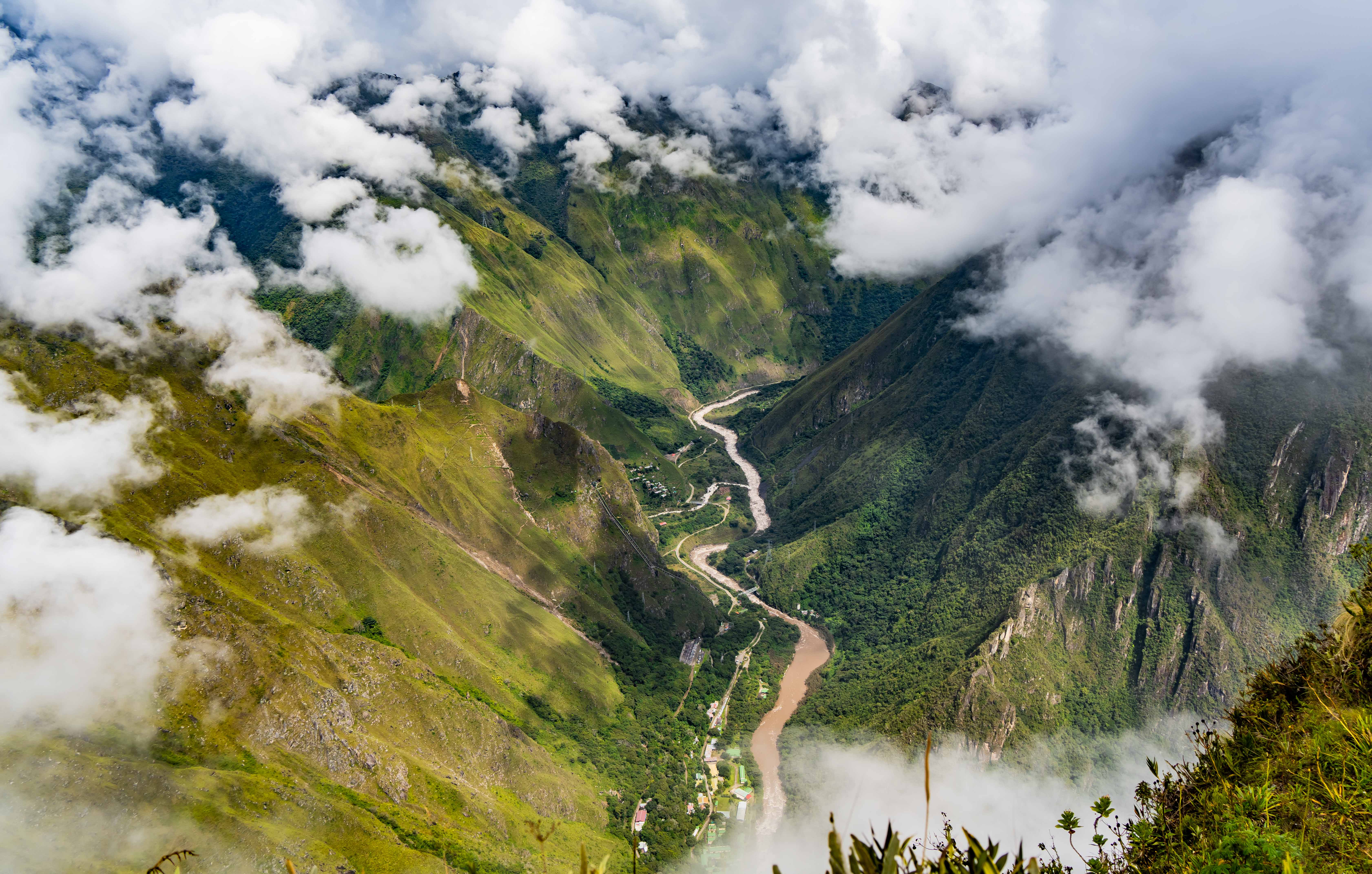 山上云层比较厚,云卷云舒偶尔露出西侧的温泉镇和 Urubamba 河谷。。。