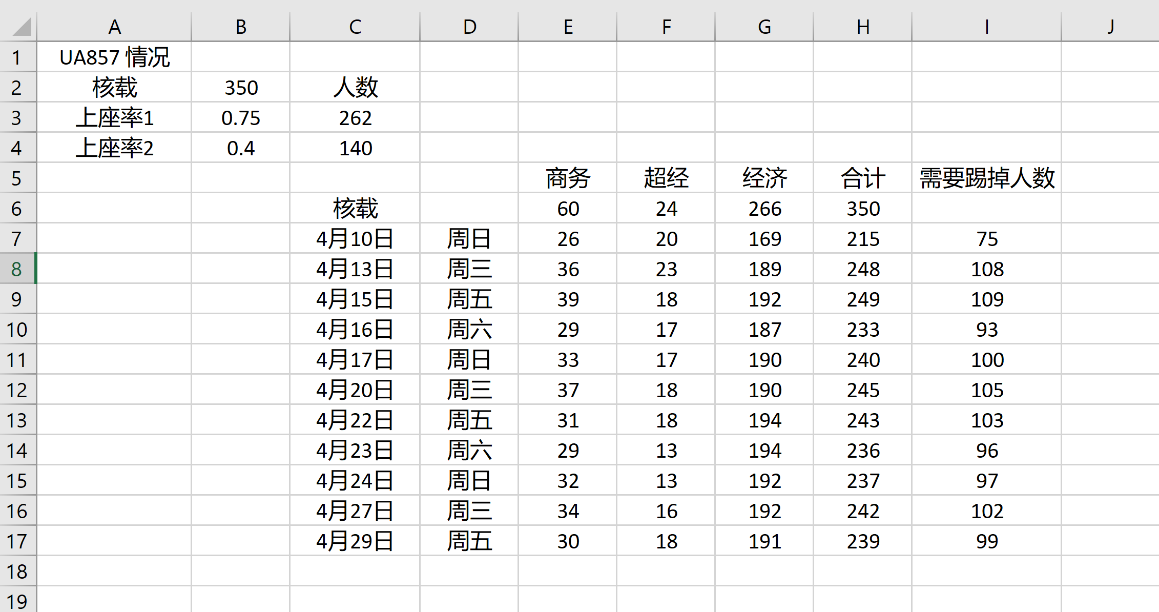 注意看4.10的情况,起飞前会有大量的退票,实际上到起飞当天退票会更多,因此最后实际上需要踢的人数可能会只有50人左右。