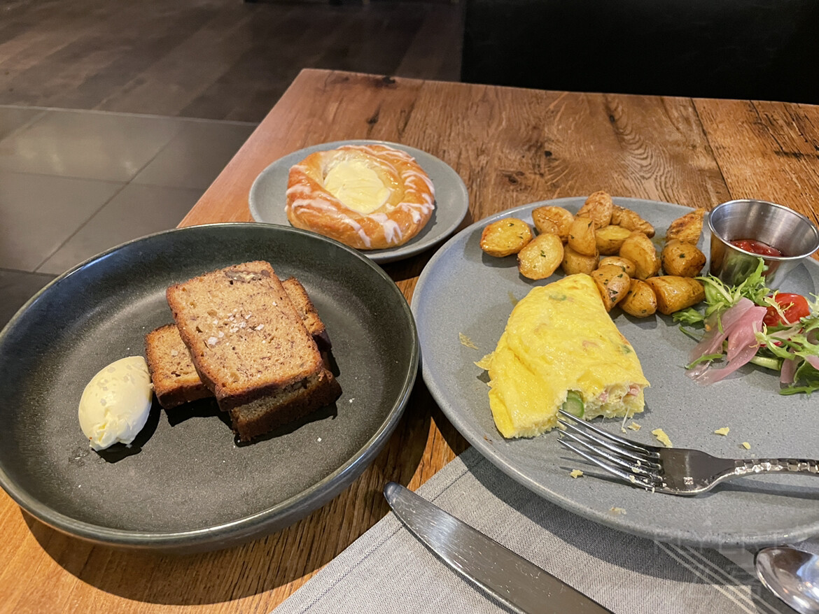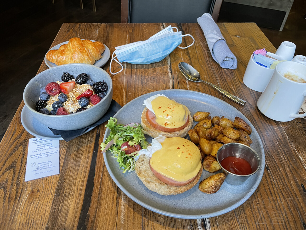 疫情原因酒廊关闭,早餐在1楼餐厅,单点每人27刀,按入住人数算。量还挺大,基本就是一下三明治 蛋类和面包。本尼迪克特蛋还不错,香蕉面包也好吃,两个人54刀额度绰绰有余