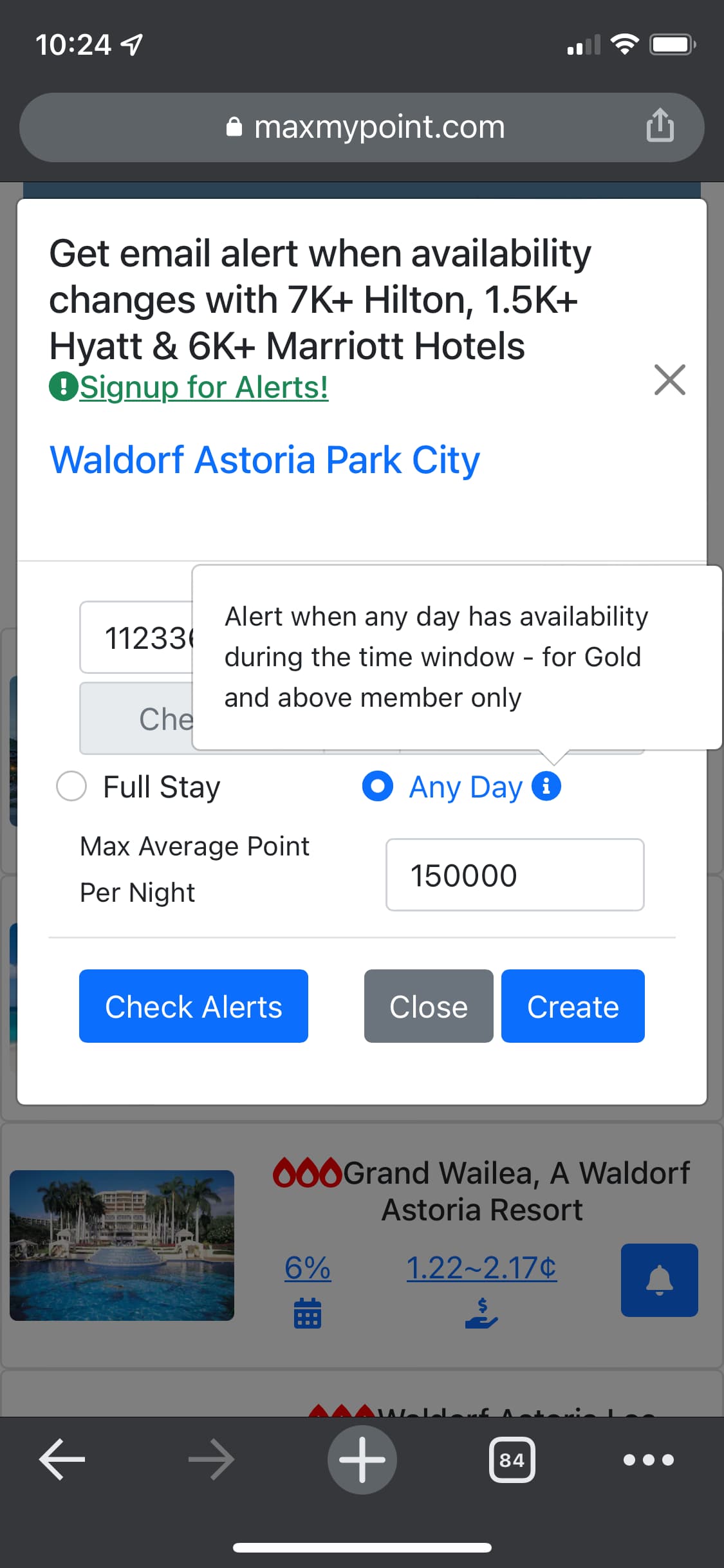 应广大用户要求,MaxMyPoint 现已支持Hilton和Hyatt 酒店的Any Day Alert功能,也就是指定日期时间段内任何一晚有积分房都会发邮件通知,目前仅限Gold以上级别使用以及时间段不能超过5天。