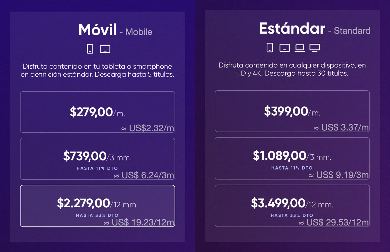 根据阿根廷、巴西、墨西哥目前的套餐,包三个月省 11%、包年省 33% 应该是整个拉丁美洲通用的。