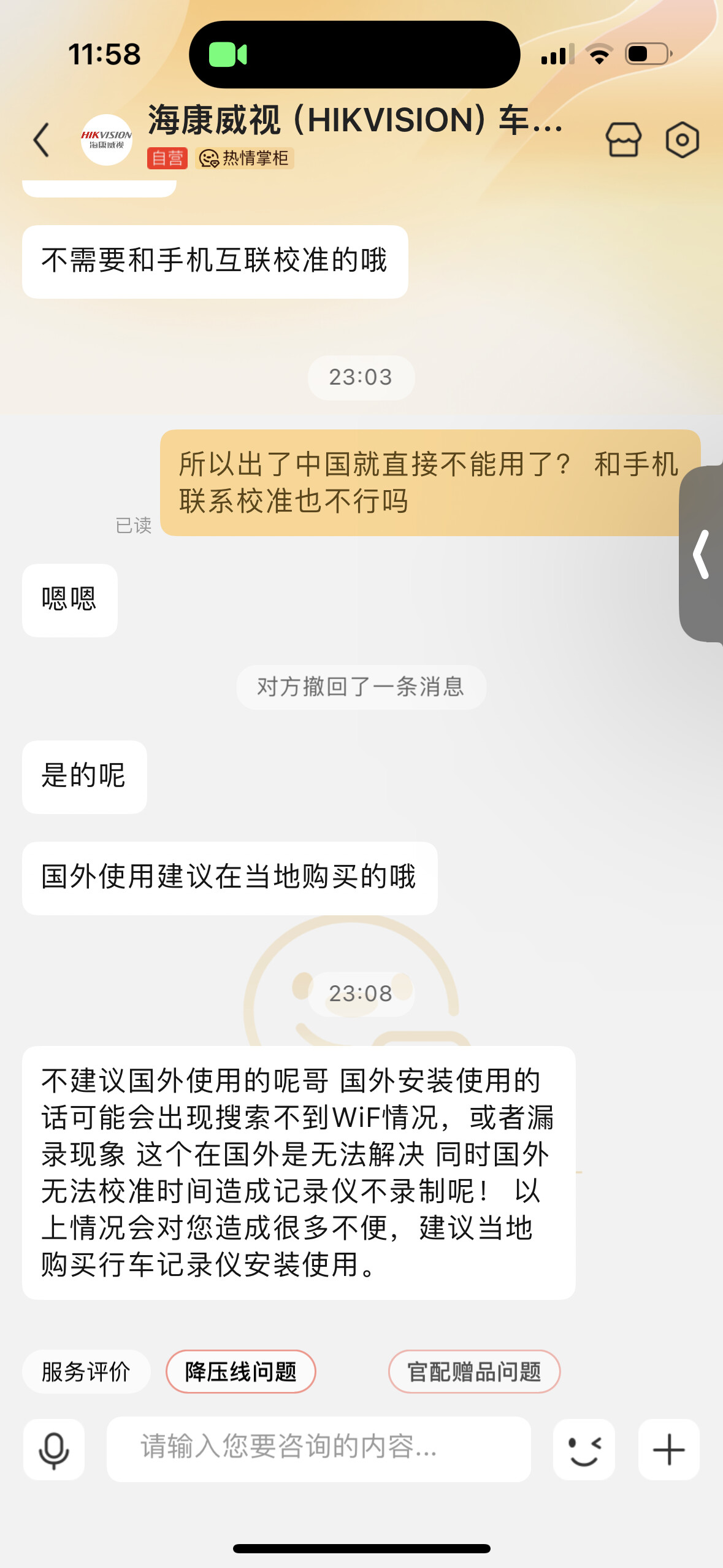话说我问了一波京东的海康威视,他们说他们的dash cam不能在国外用因为不能校准时间。。。